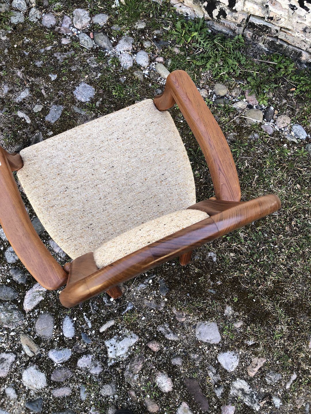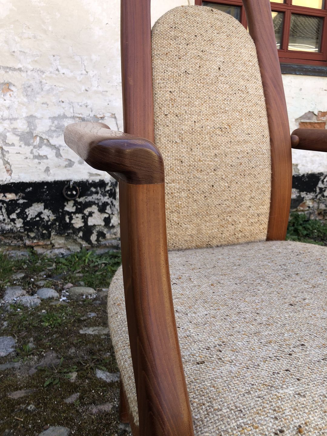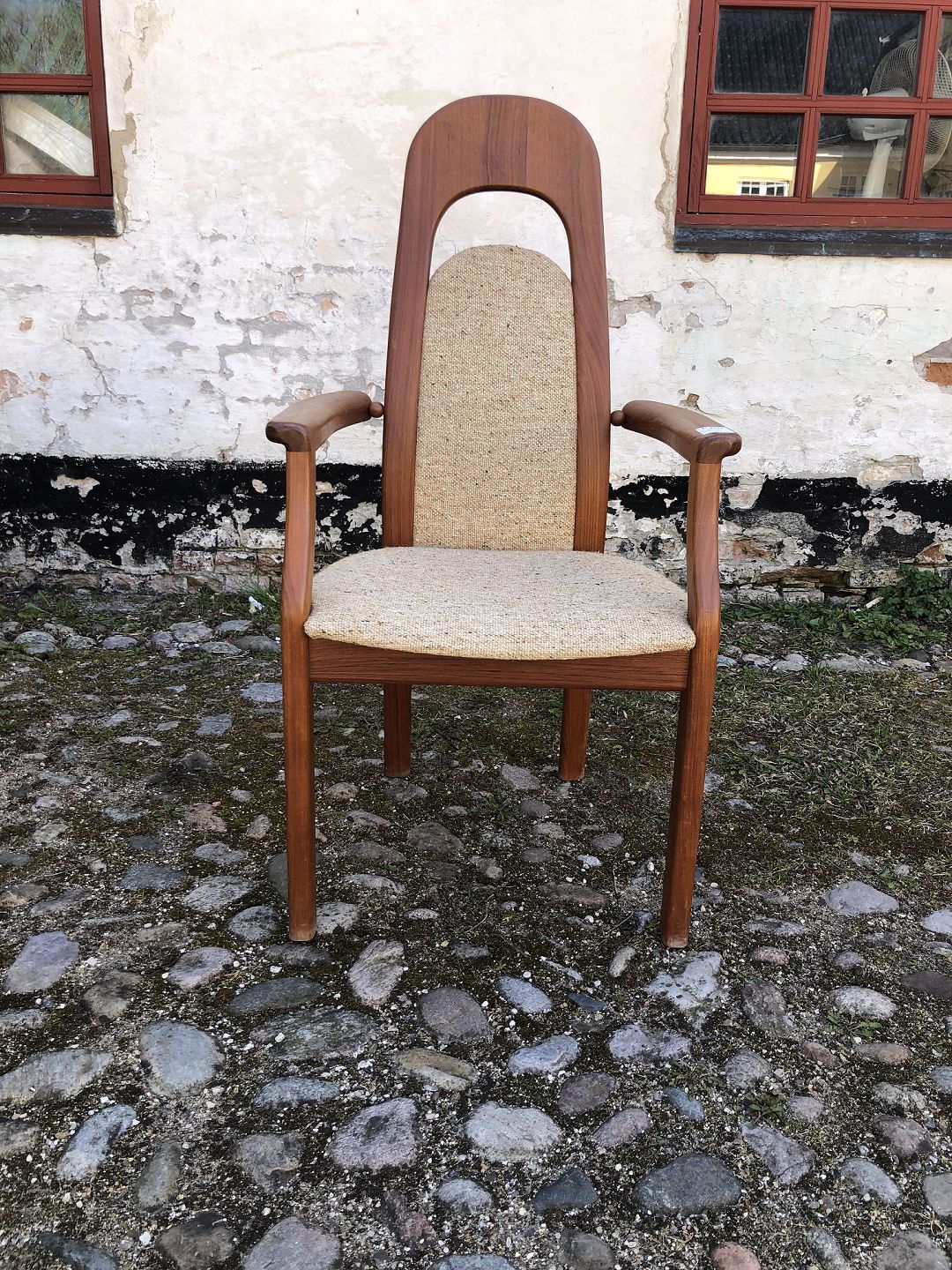 EMC Furniture højrykket armstol af massiv teaktræ betrukket med lys uld.