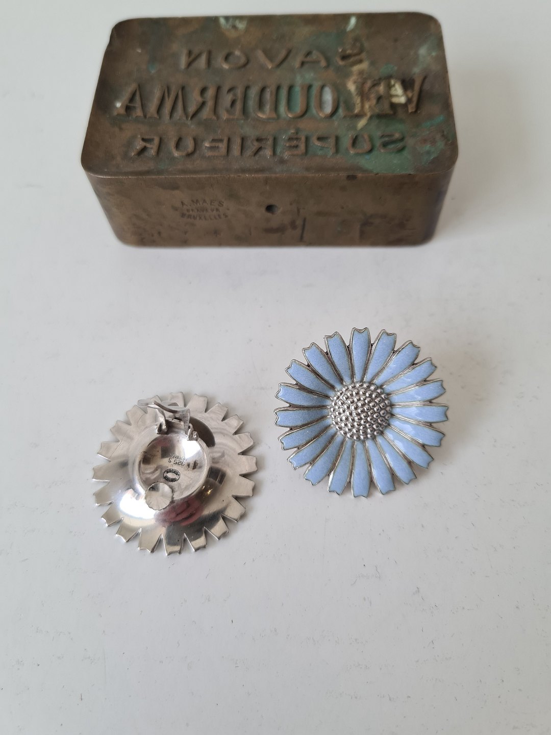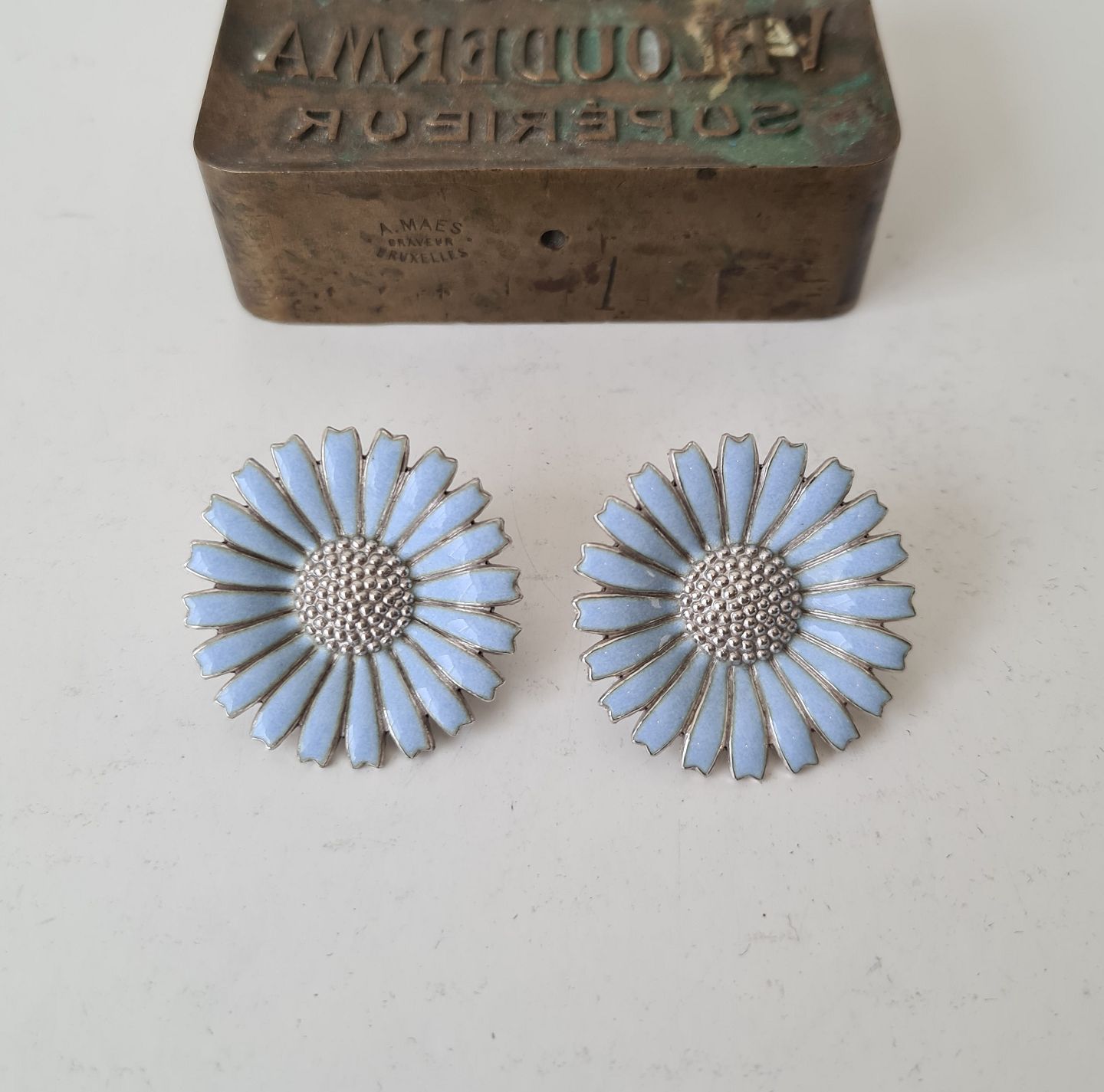 Georg Jensen Margueritte - Daisy øreklips i sterlingsølv og lyseblå emalje 3,2 cm.
