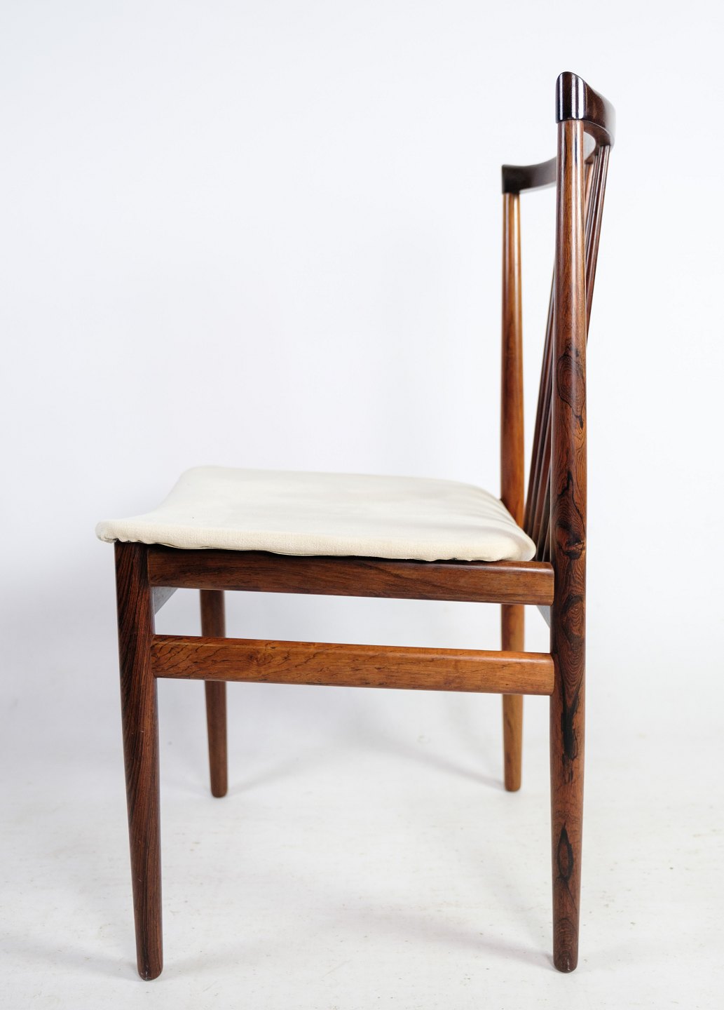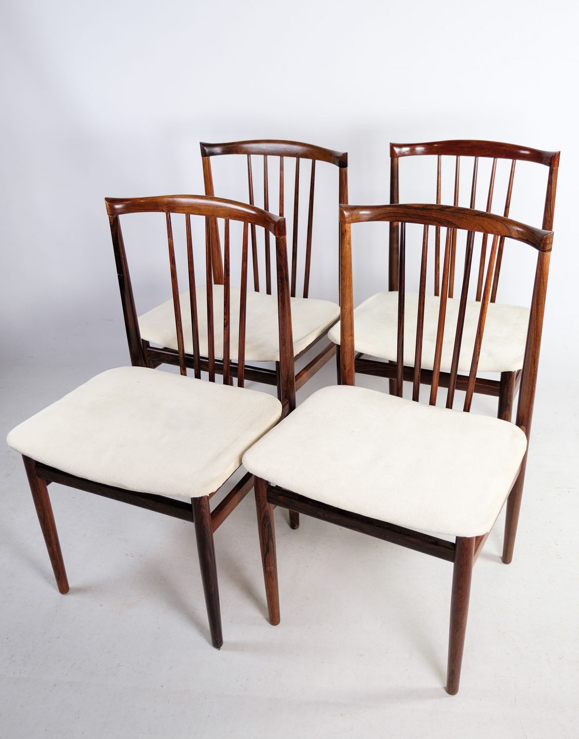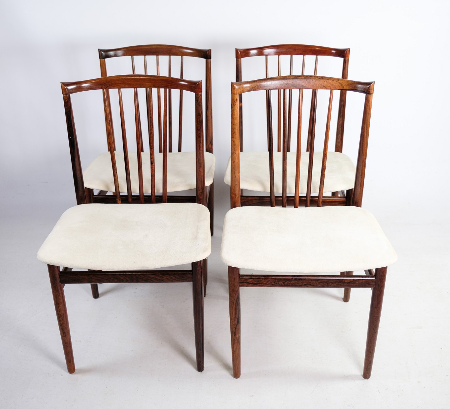 Et sæt af fire Spisestuestole i palisander designet af Henning Sørensen i 1968. Stolene fremstår i meget god stand med lyst stof.
