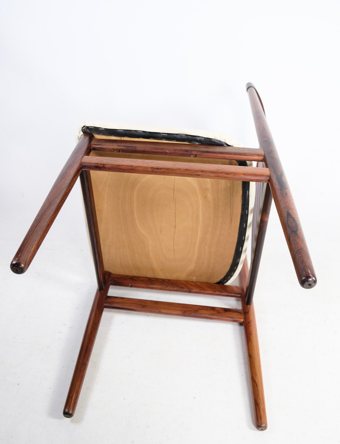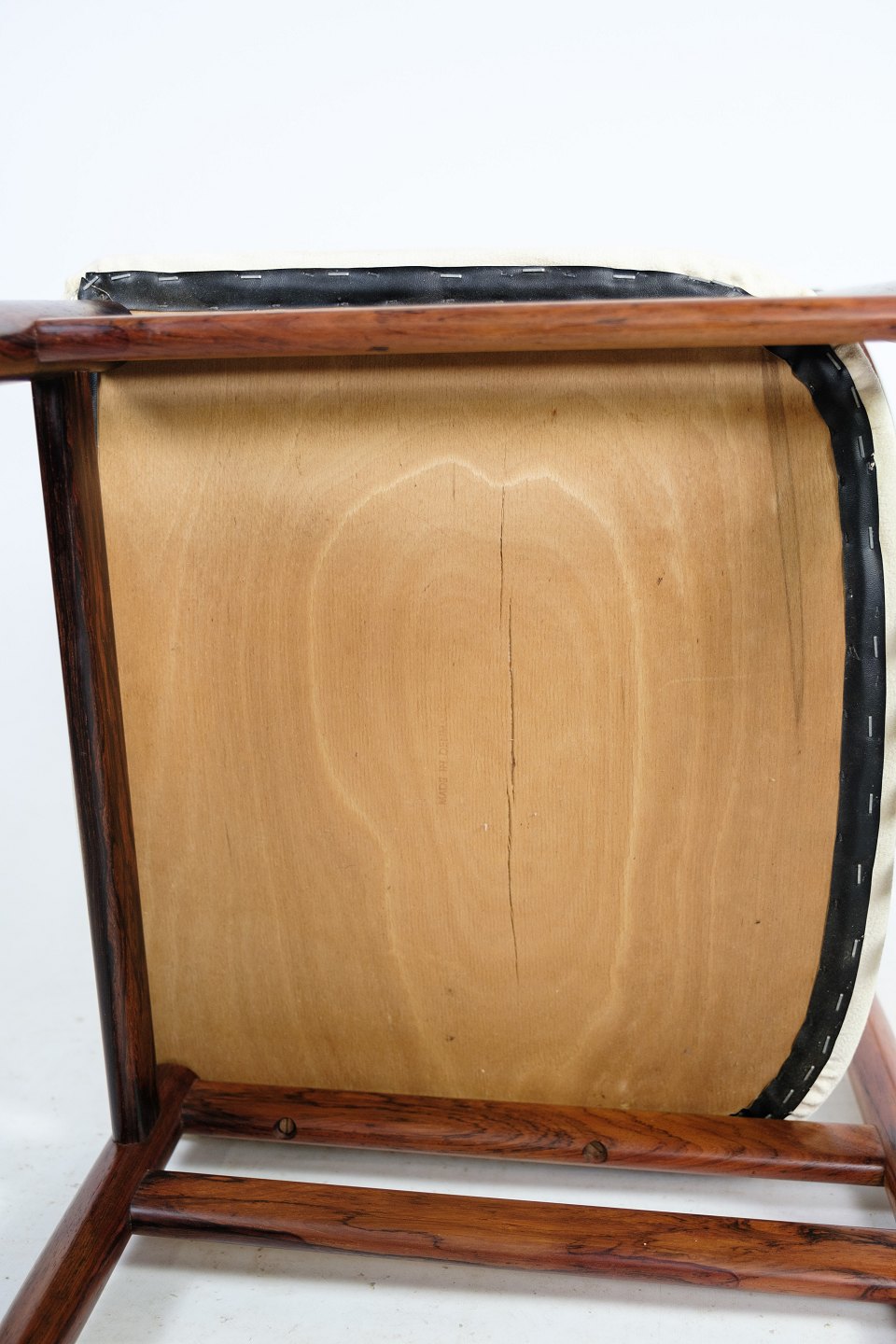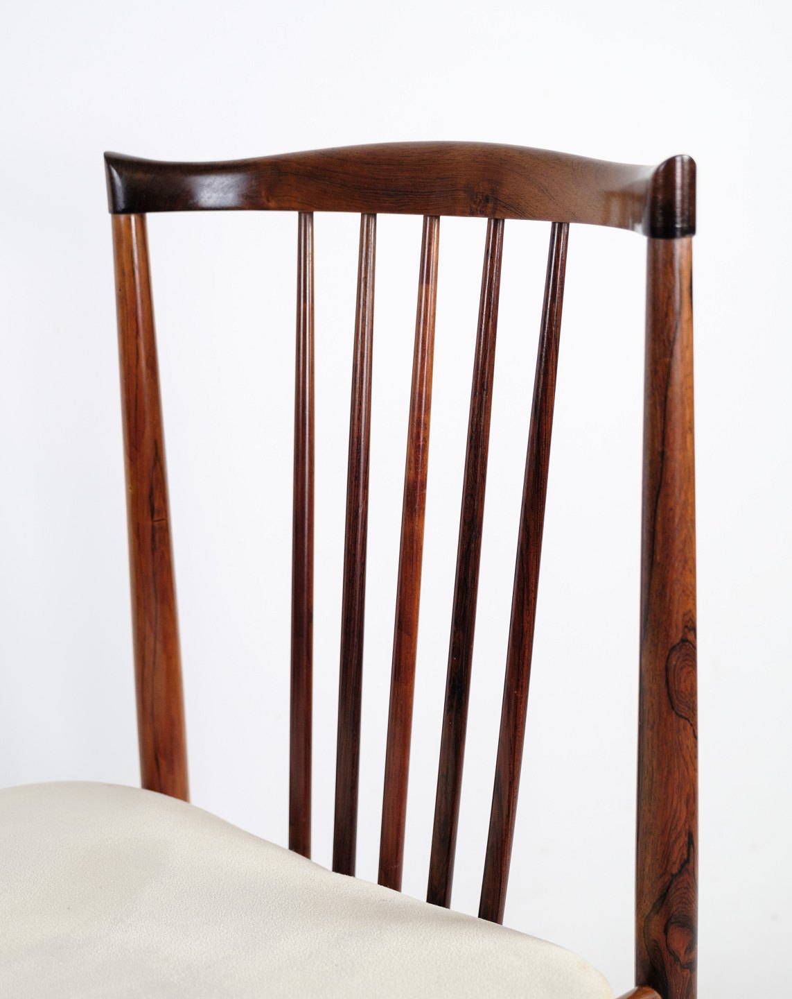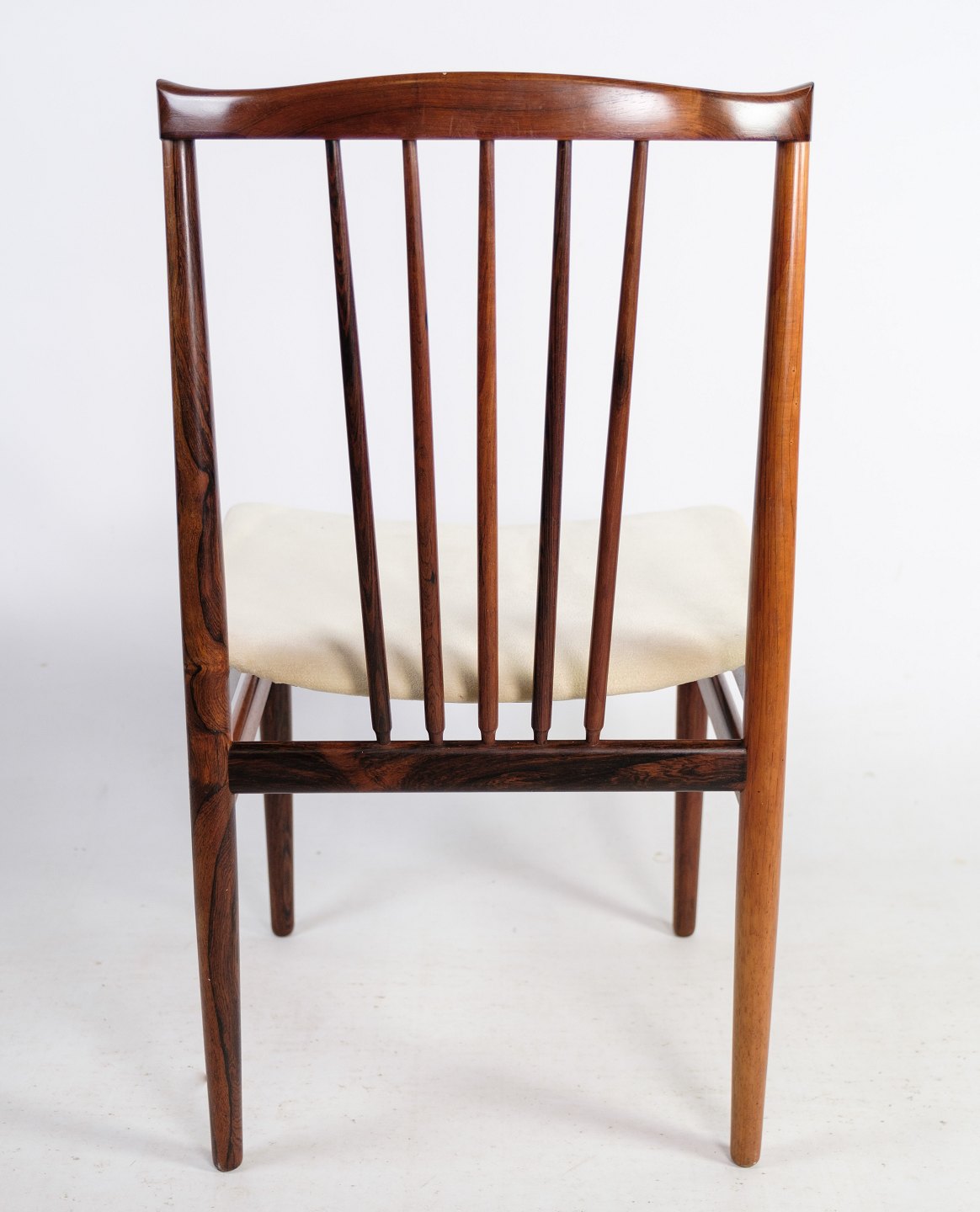 Et sæt af fire Spisestuestole i palisander designet af Henning Sørensen i 1968. Stolene fremstår i meget god stand med lyst stof.