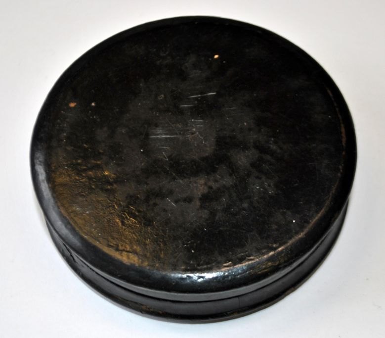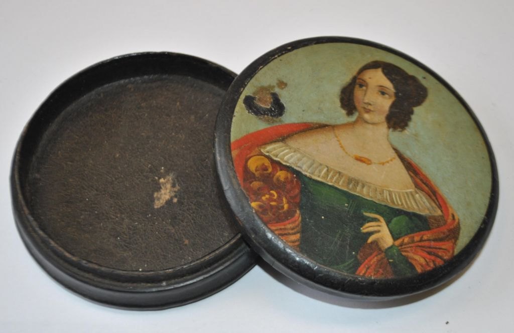 Empire papmache æske med håndmalet portræt, 19. årh. Portræt af ung kvinde. Dia.: 8,5 cm. H.: 2,2 cm.