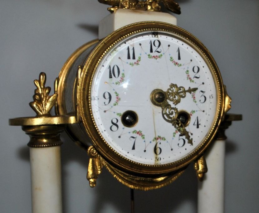 Fransk søjleur af bronze/marmor, 19. årh. Topfigur af to fugle i rede. Søjler og plint af hvidt marmor. Urskive i hvidt emalje med blomster ranker. Skiv med arabertal. Standart urværk. Stemplet.: Th. Marti. Urvisere i bronze. H.: 36 cm. B.: 19,3 cm.