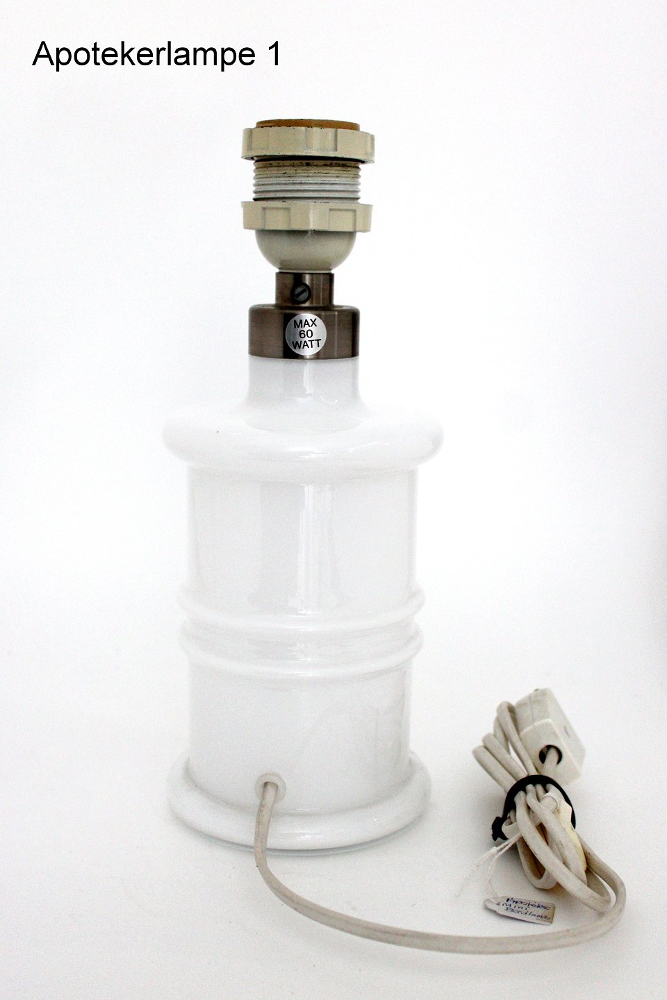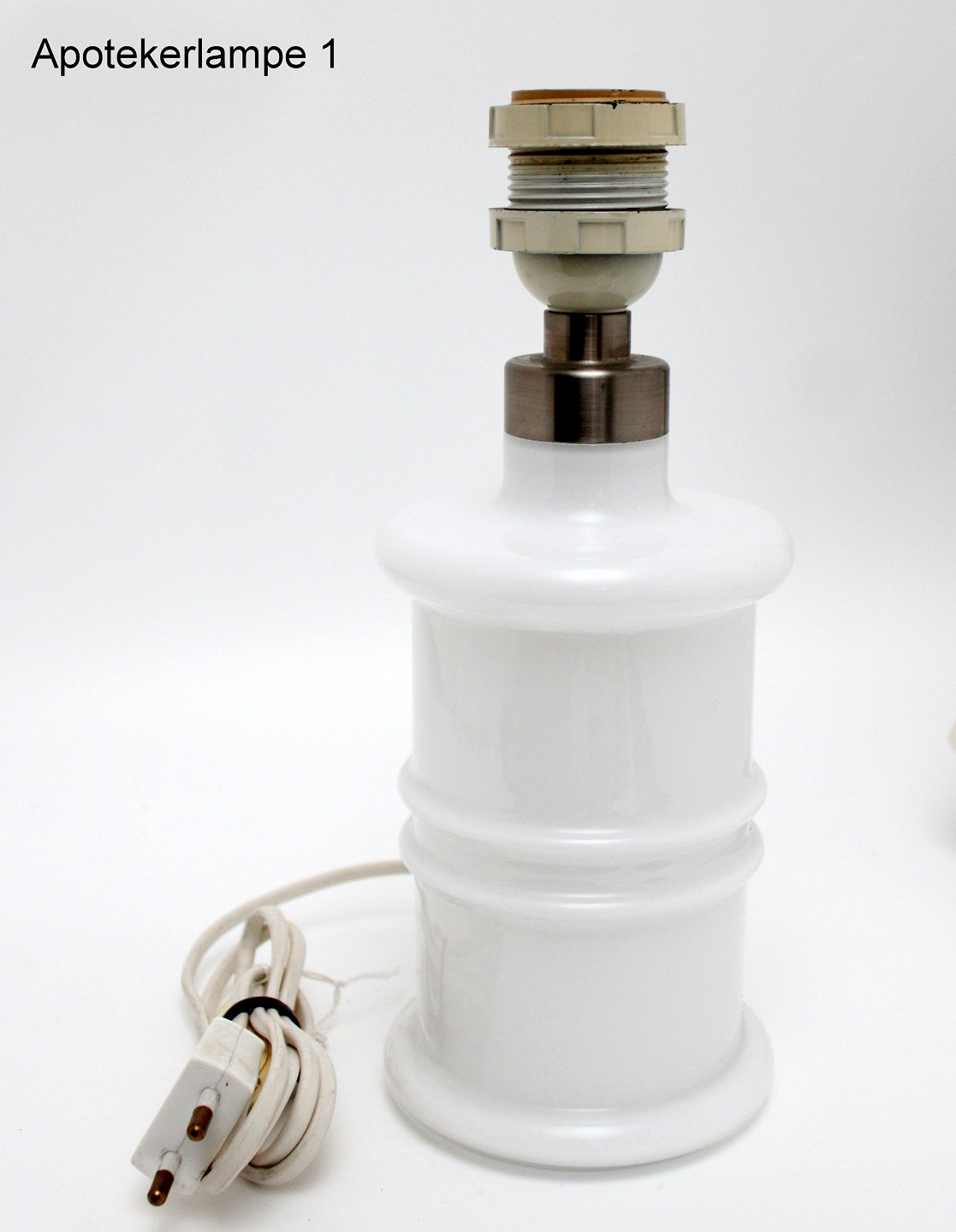 Holmegaard, Apoteker serien, Mini hvid opaline lampe. Designet af Sidse Werner 1985. Højde incl. fatning ca. 26 cm. Diameter 11 cm. Fin stand dog med lettere misfarvet gullig afbryder på dem begge. (Modelfoto). Pris: 550 kr. stk. Lager: 2