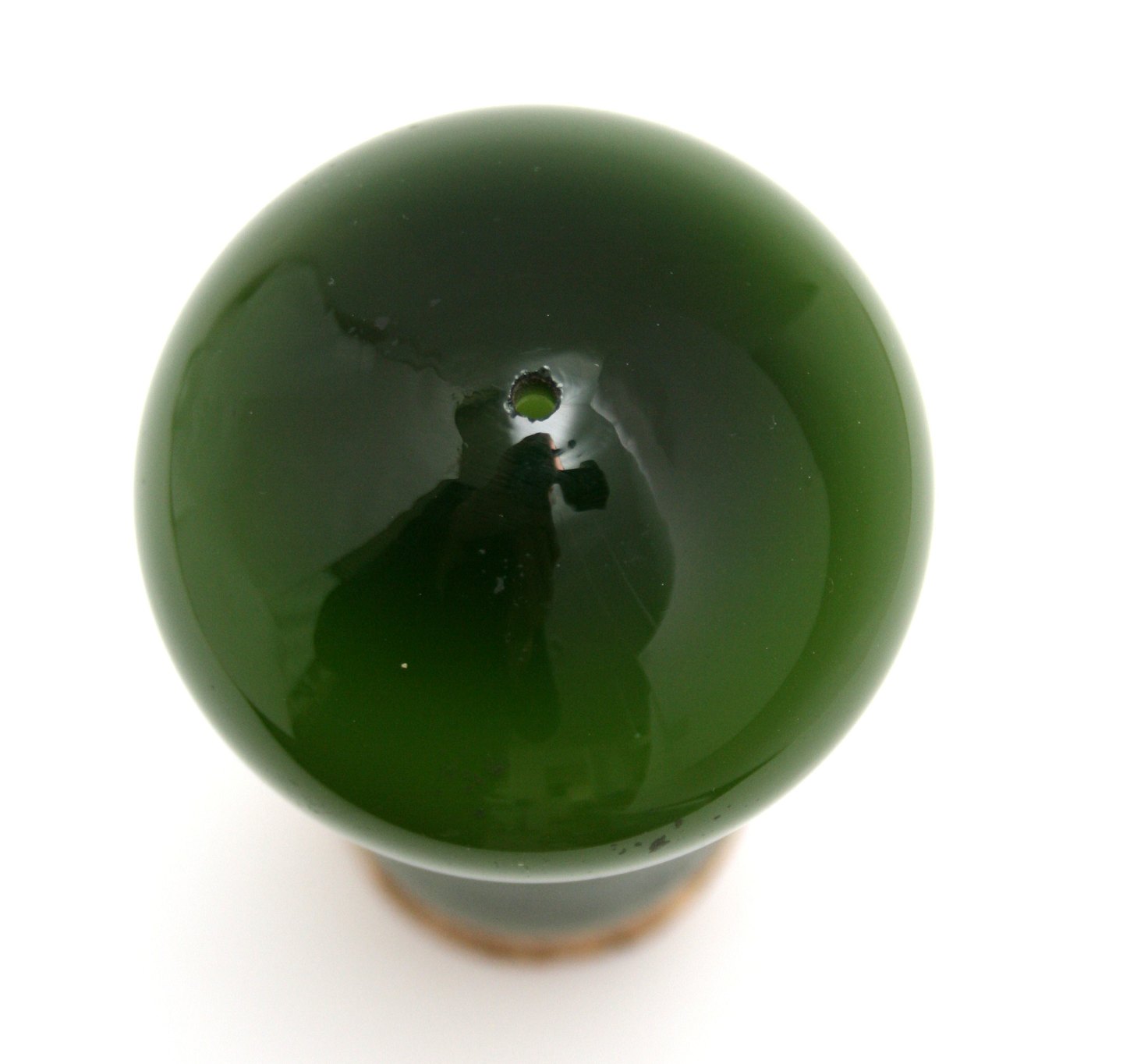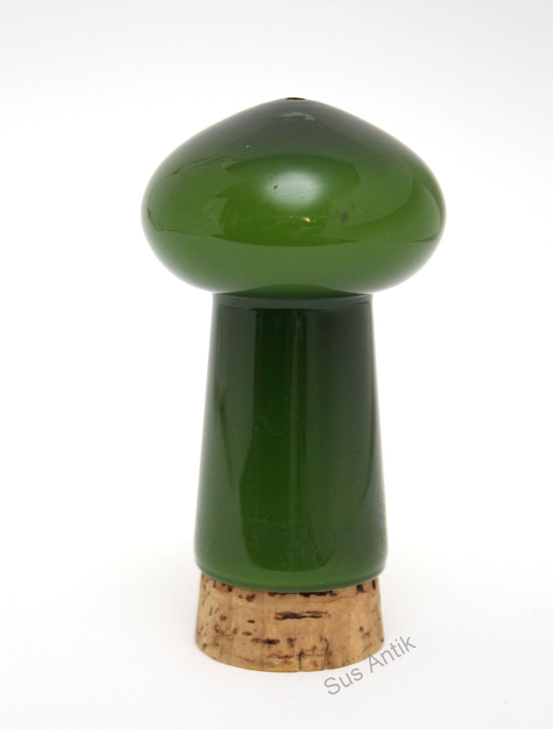 Holmegaard, Palet, Jadegrøn Saltbøsse med korkprop. Designet af Michael Bang i 1969, udgår i 1976. Højde med prop 11,5 cm. uden prop 9,5 cm. Mikroskopiske afslag ved strøhullet. Pris: 275 kr.