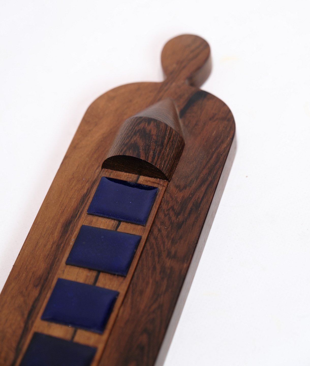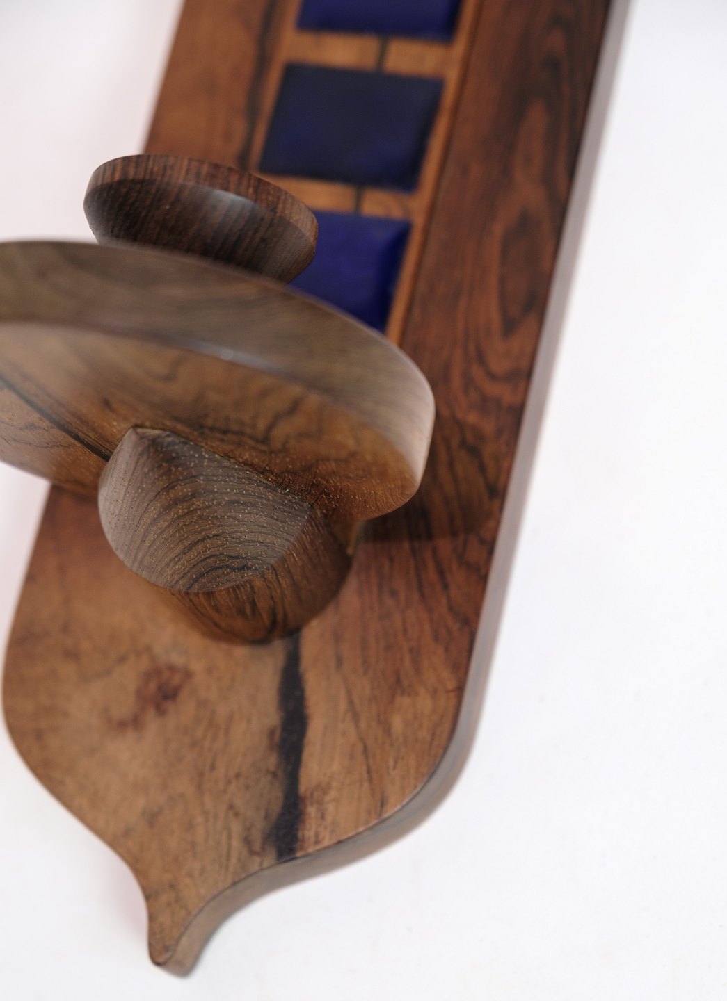 Wall candle holder in the wood type rosewood with inlays in bluish colors from around the 1960s.