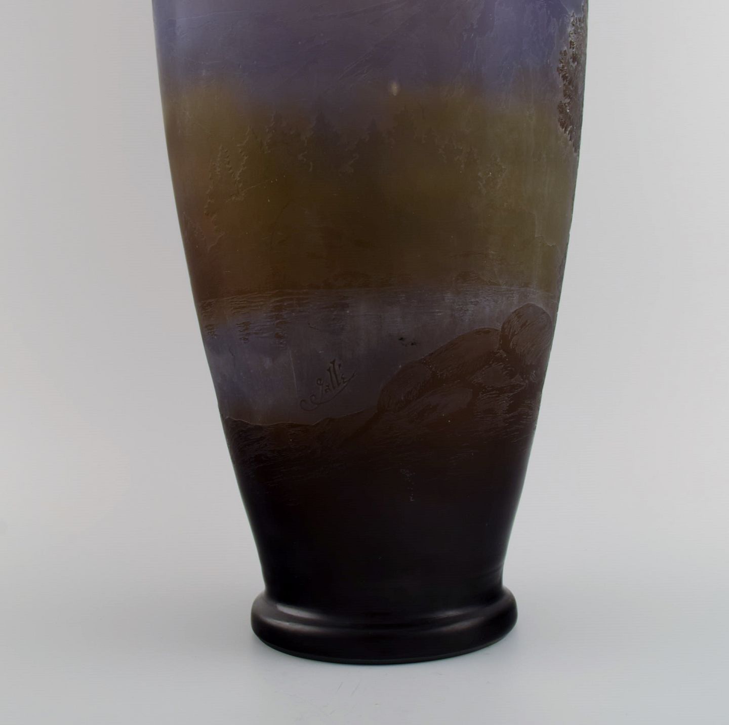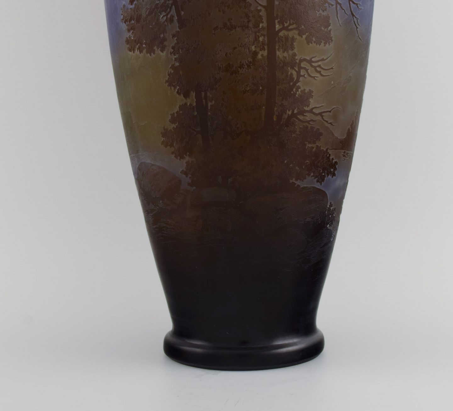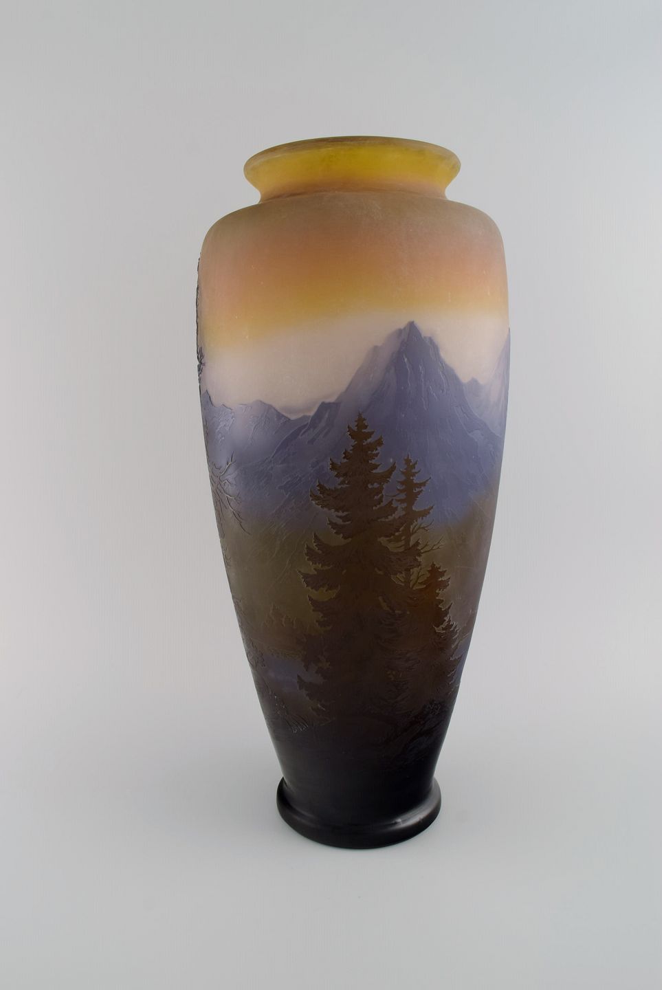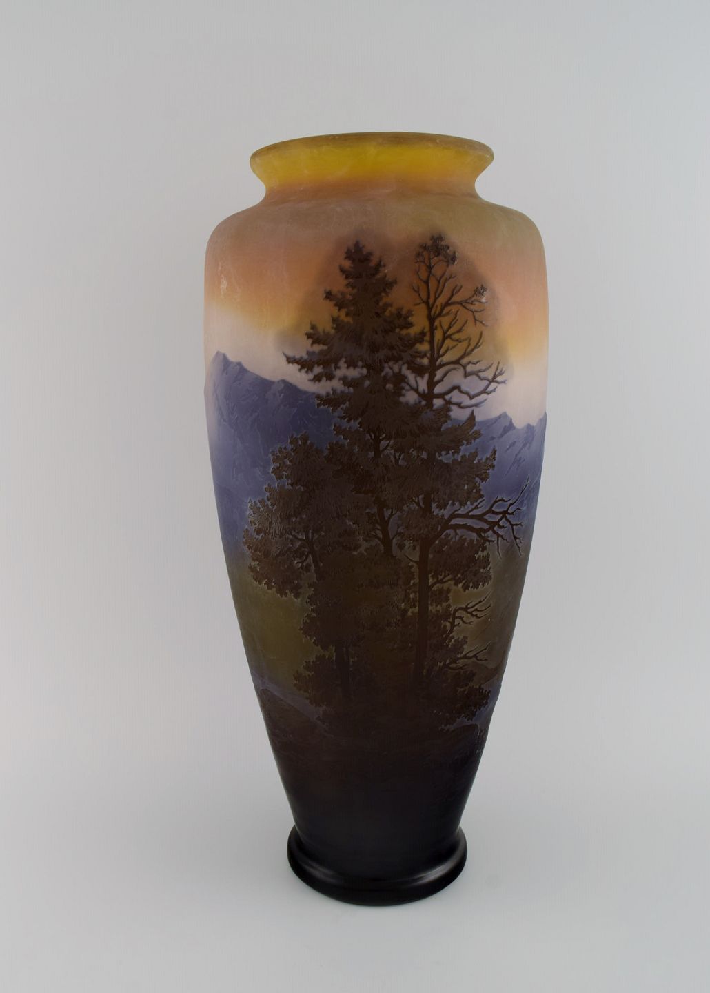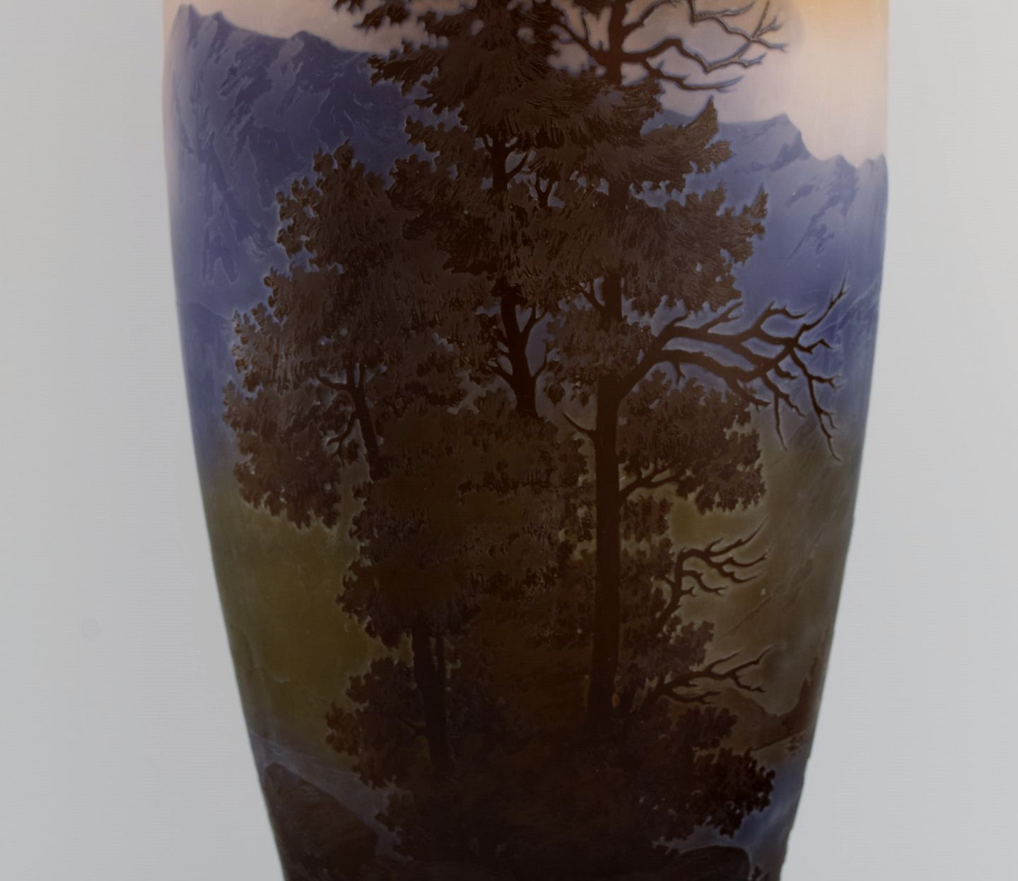 Émile Gallé (1846-1904), Frankrig. Meget stor og sjælden "Vosges" vase i mundblæst cameo kunstglas. Bjerglandskab med træer i relief. Ca. 1900.