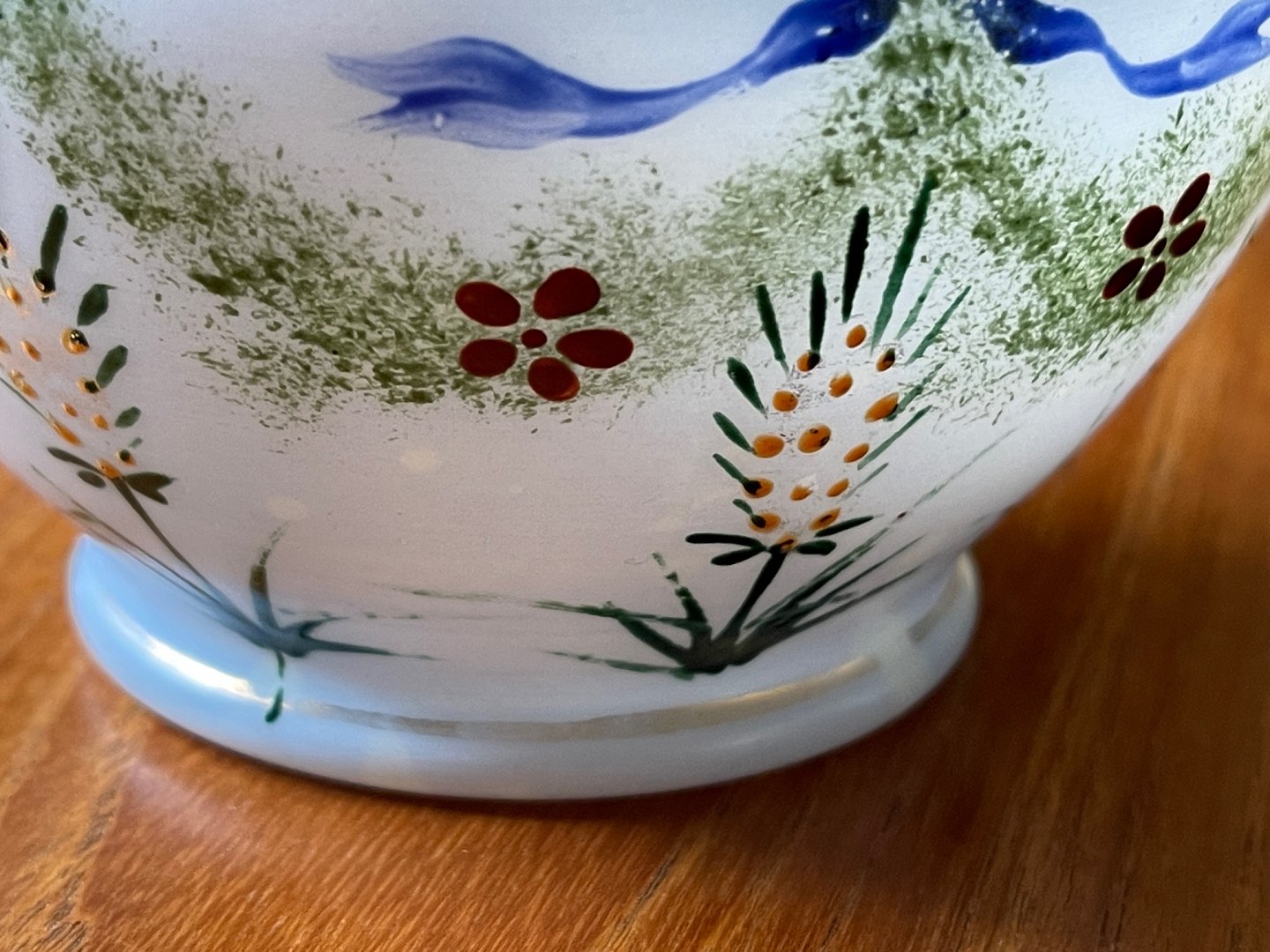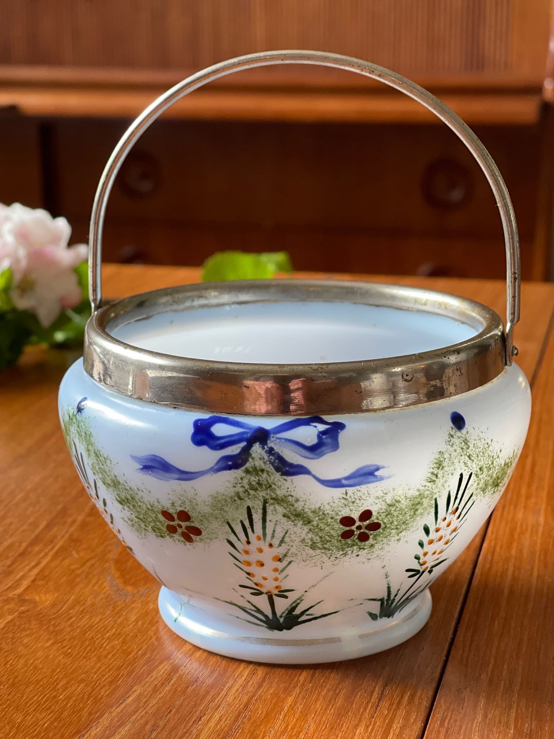 Antique sugar bowl in opal glass with mounting and handle of metal. Motif with flowers and bow.