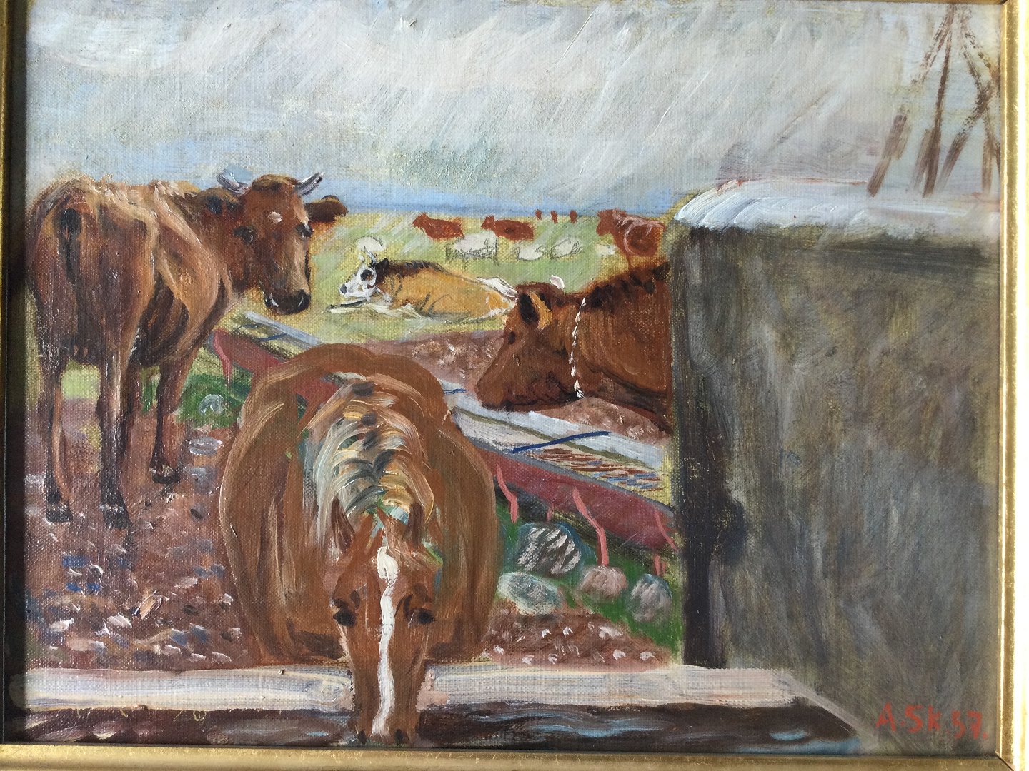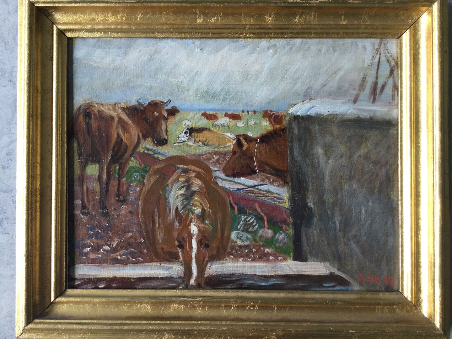 Text zugänglich auf Dänische: Maleri af Axel Skjelborg - Heste og køer bed Gammelgårds Brønd, Saltholm 1957.