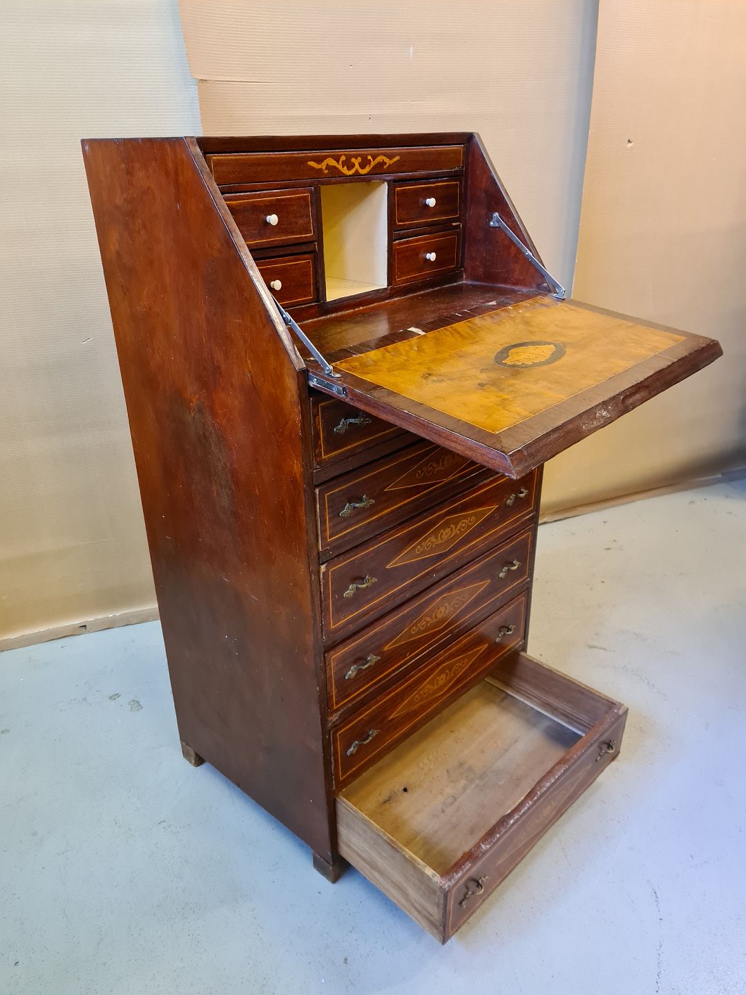 Kommode med skriveplads i fineret mahogni fra 1910erne.