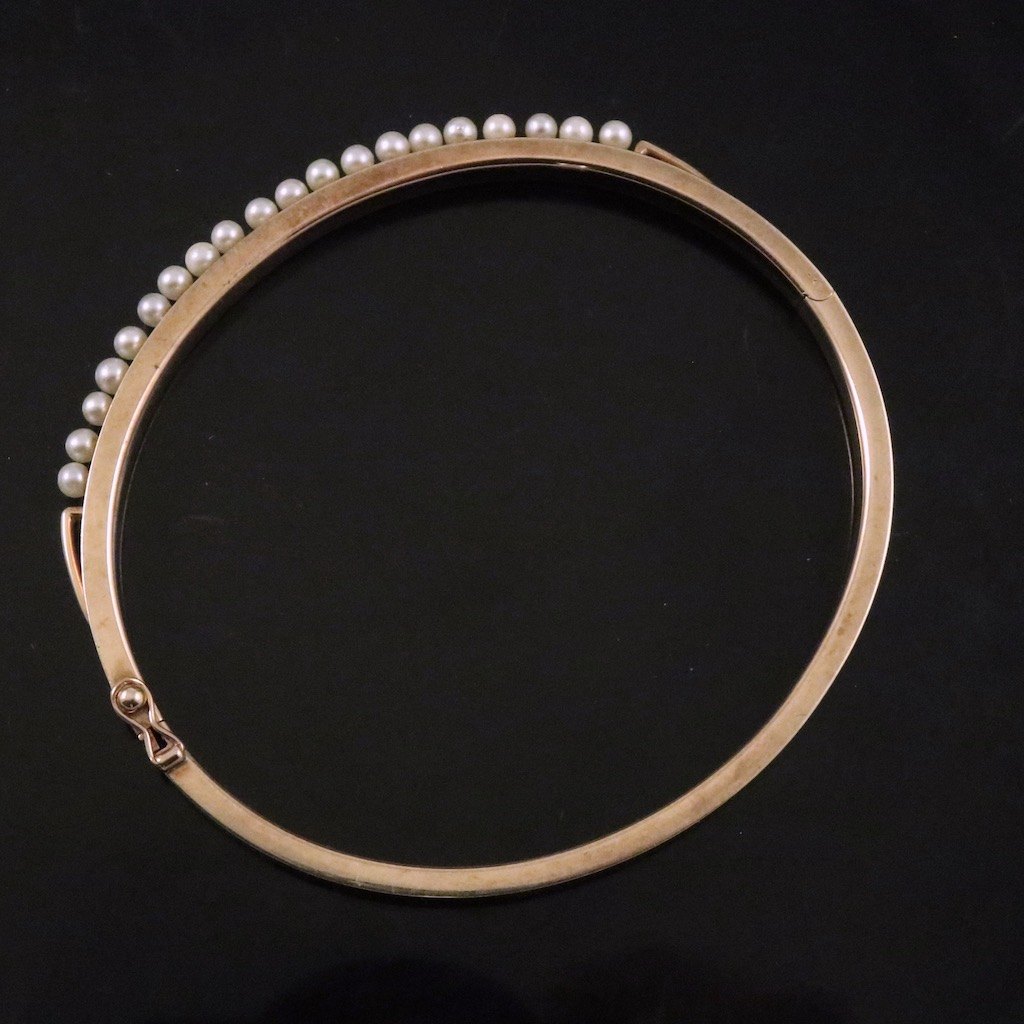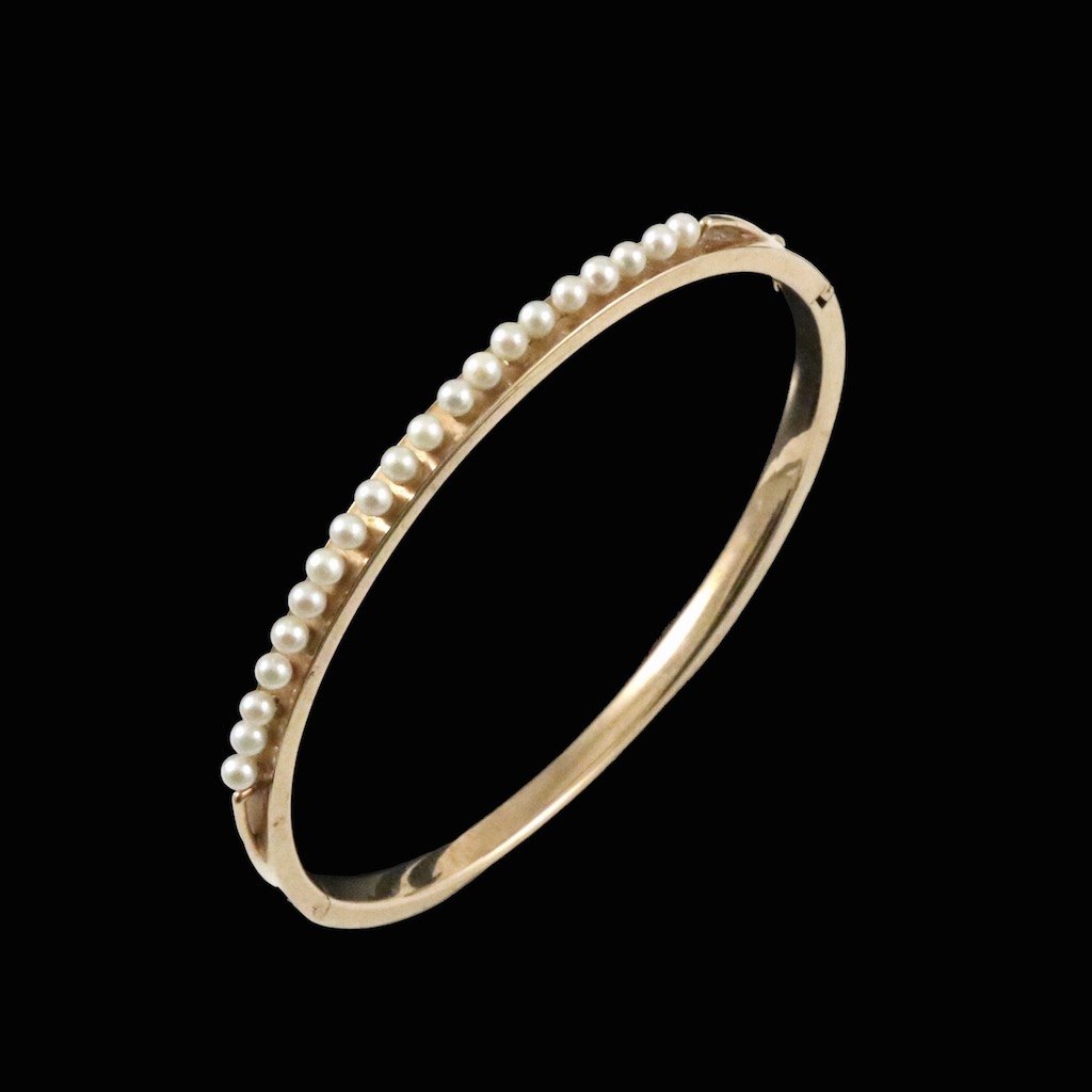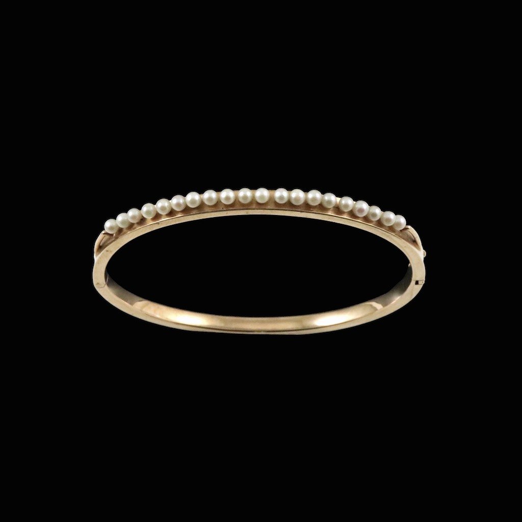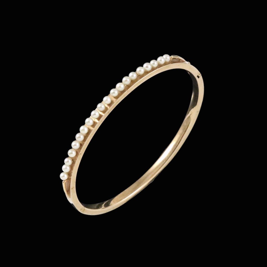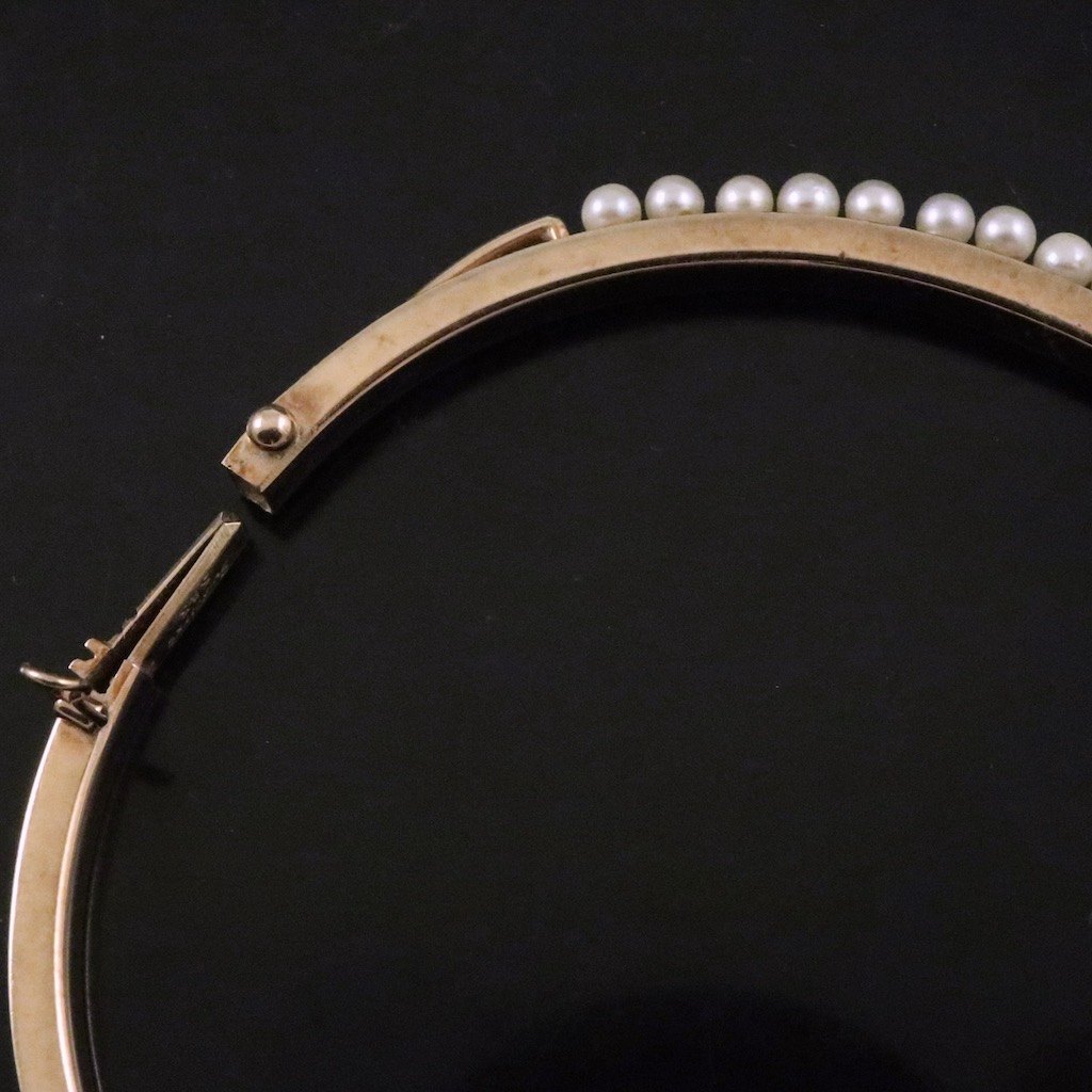 Guldvirke. Hæbgslet armring i 14k guld med perler.
