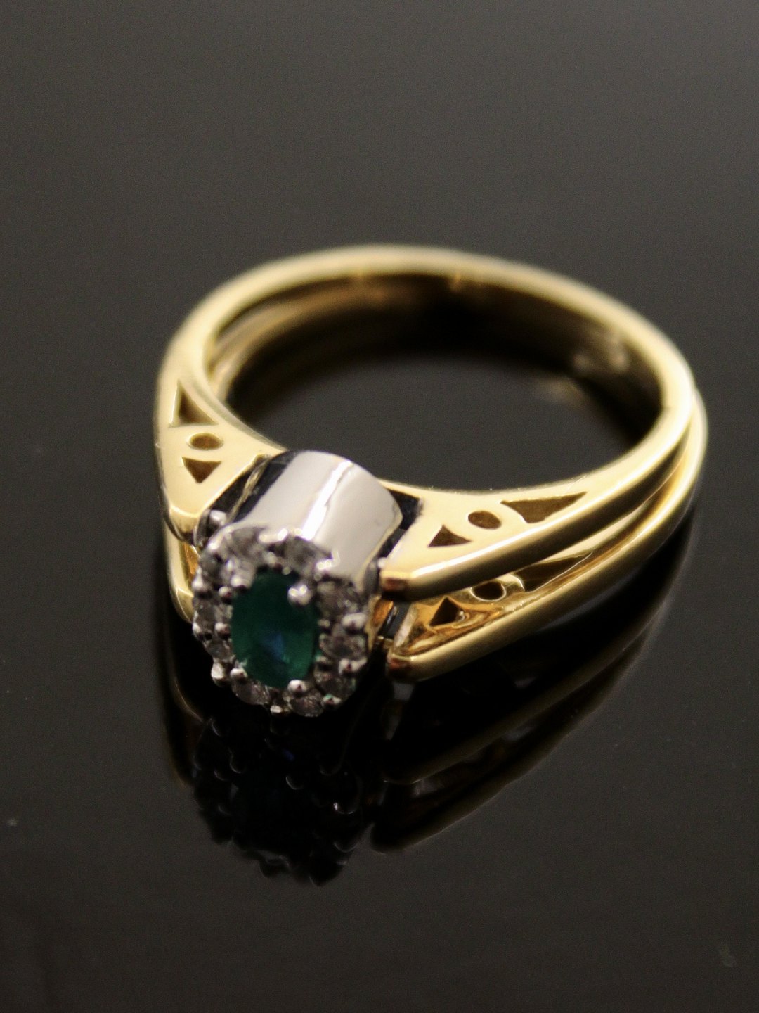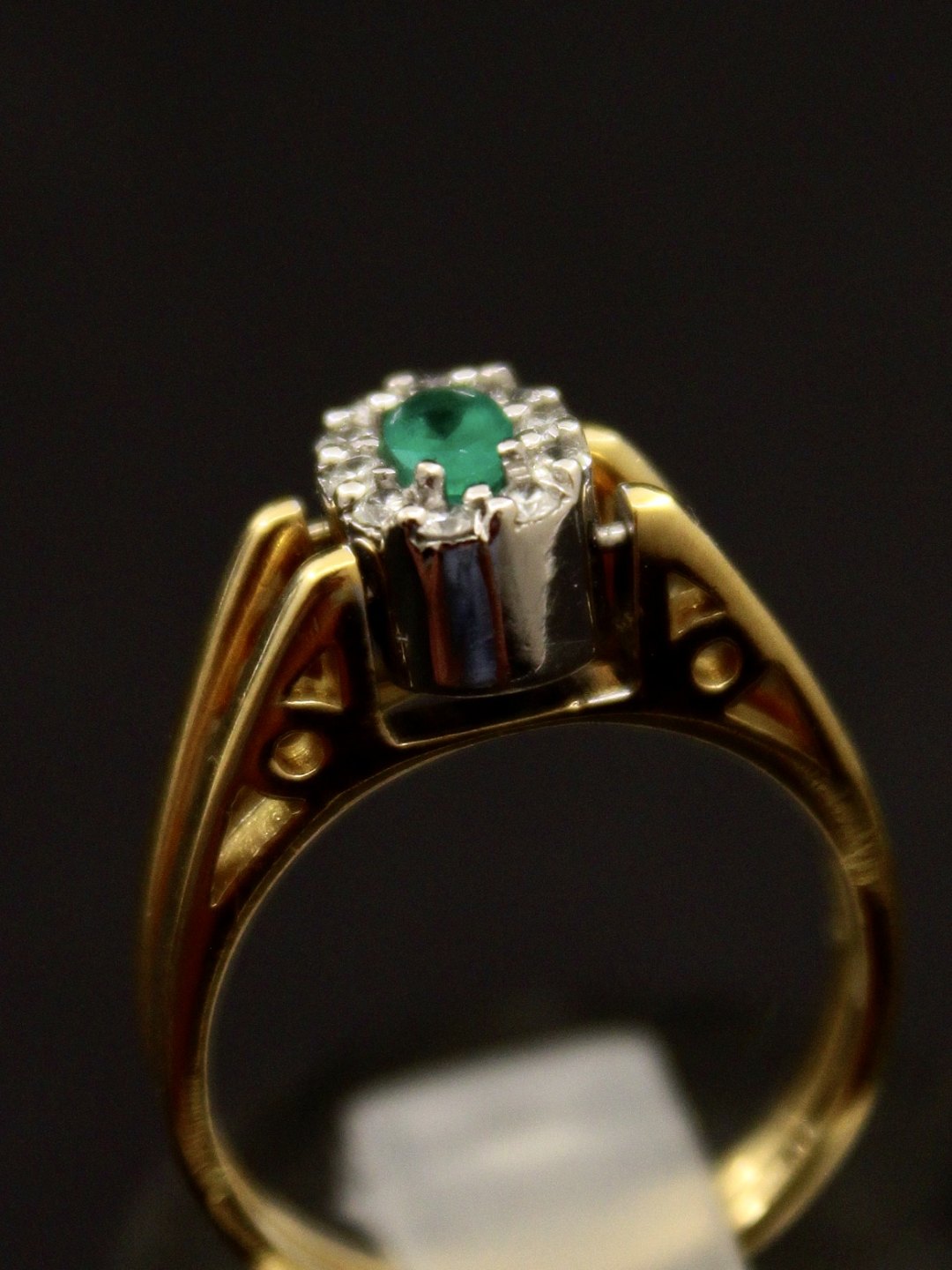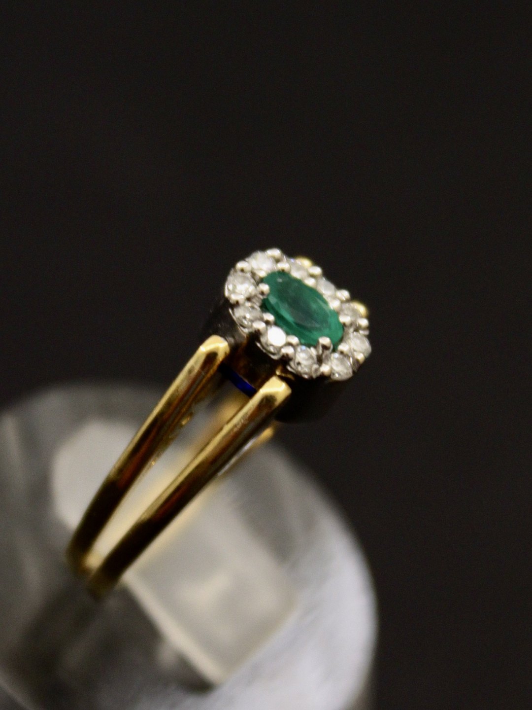 18 karat guld vende ring størrelse 53 smaragd omgiver af diamanter modsat safir emne nr. 501195
