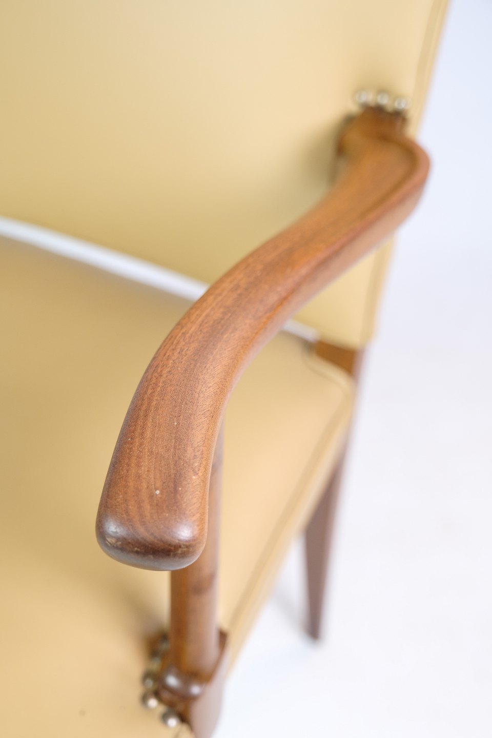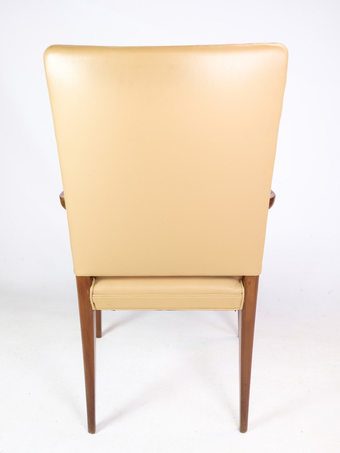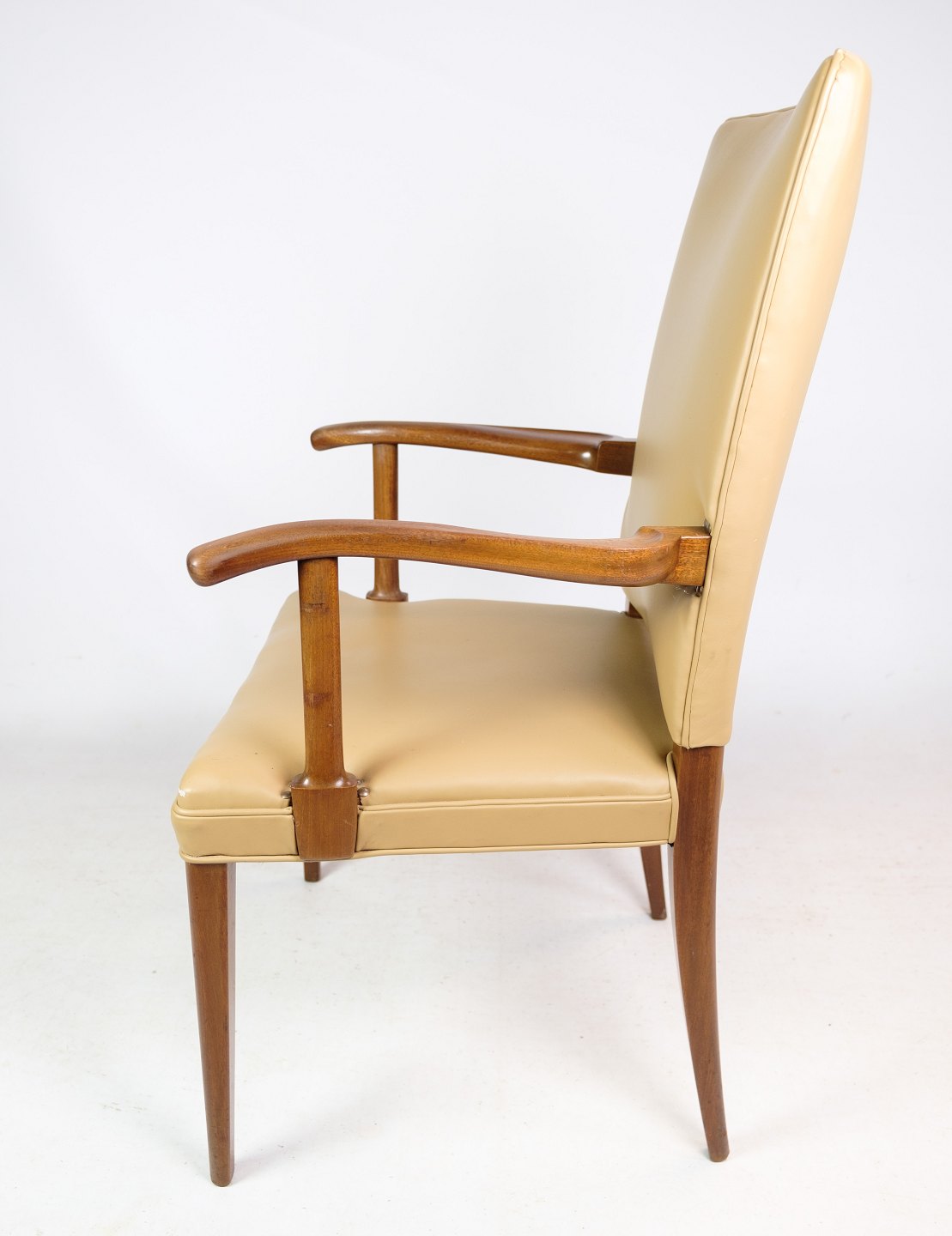 Armstol, designet af Jacob Kjær i træsorten mahogni med lyst ny polstret læder fra omkring 1950'erne. En stol med god sidde komfort og i meget fin stand.