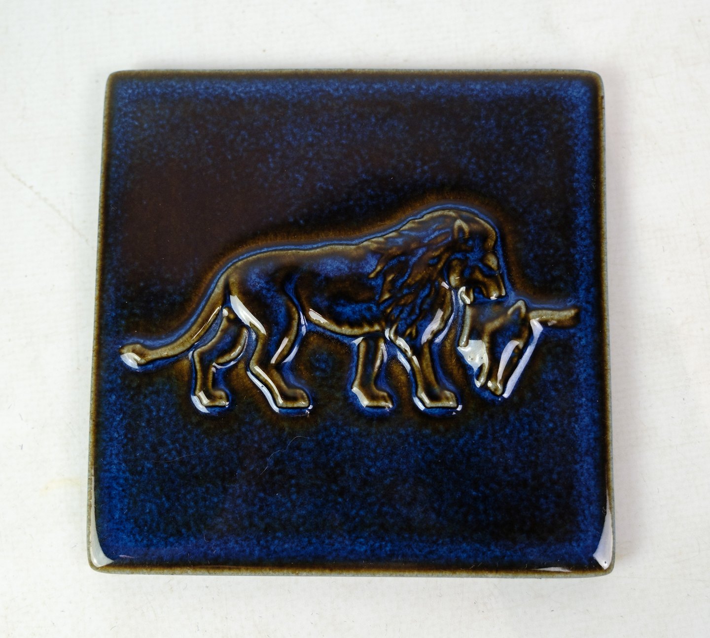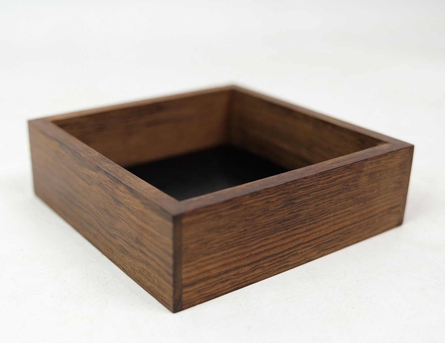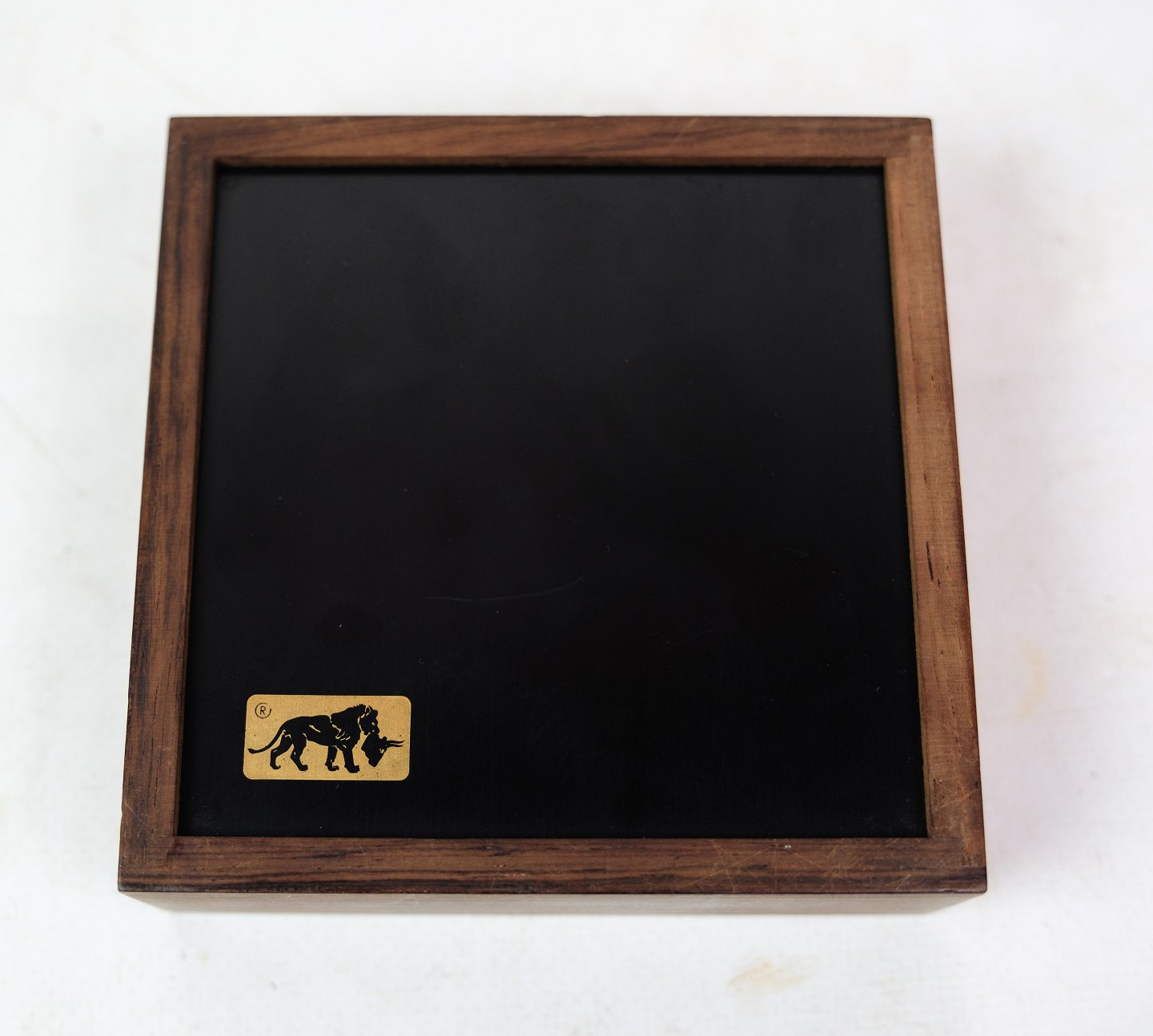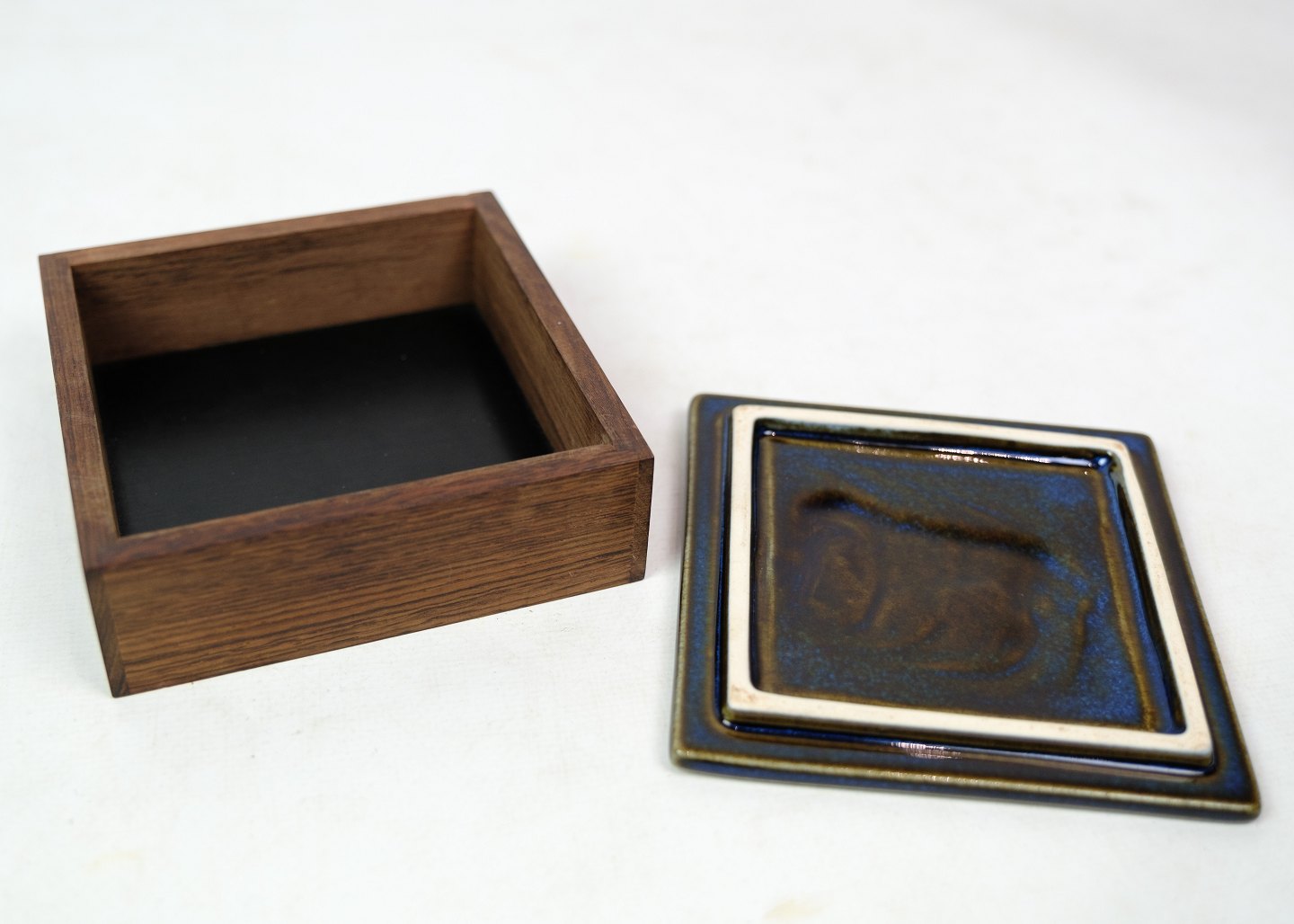 Æske af palisander med et låg af blåt keramik med mønster fra omkring 1960'erne.