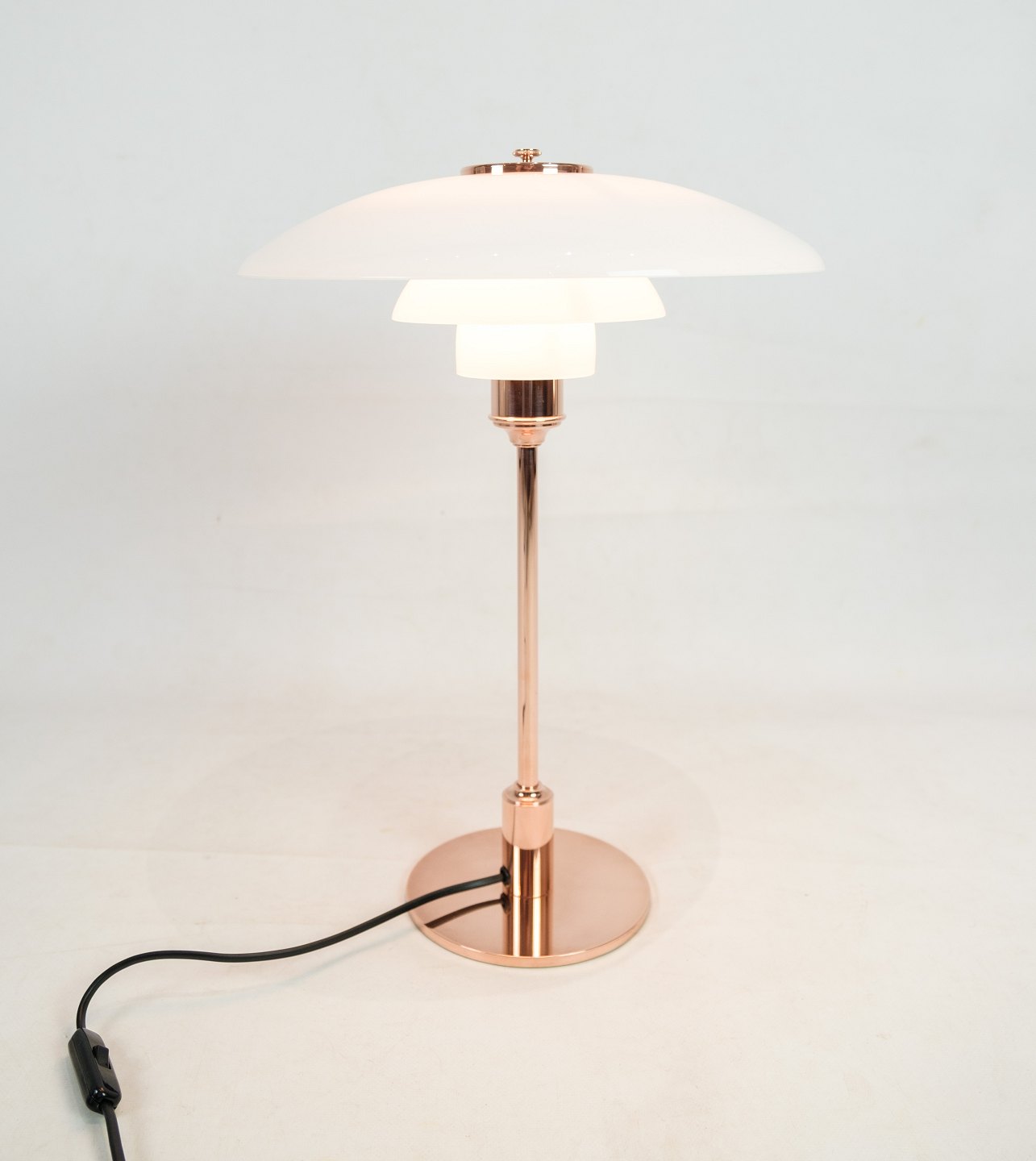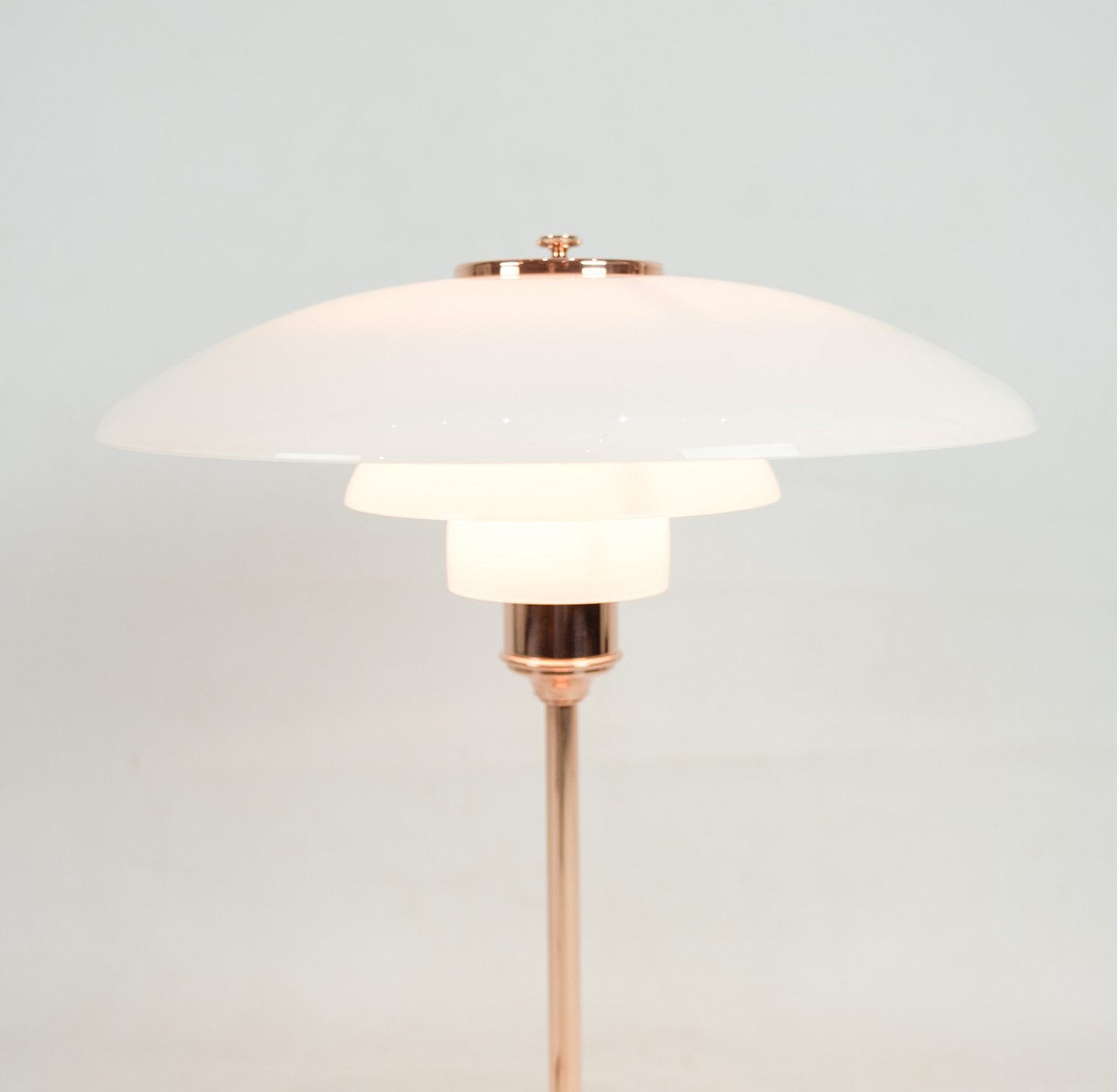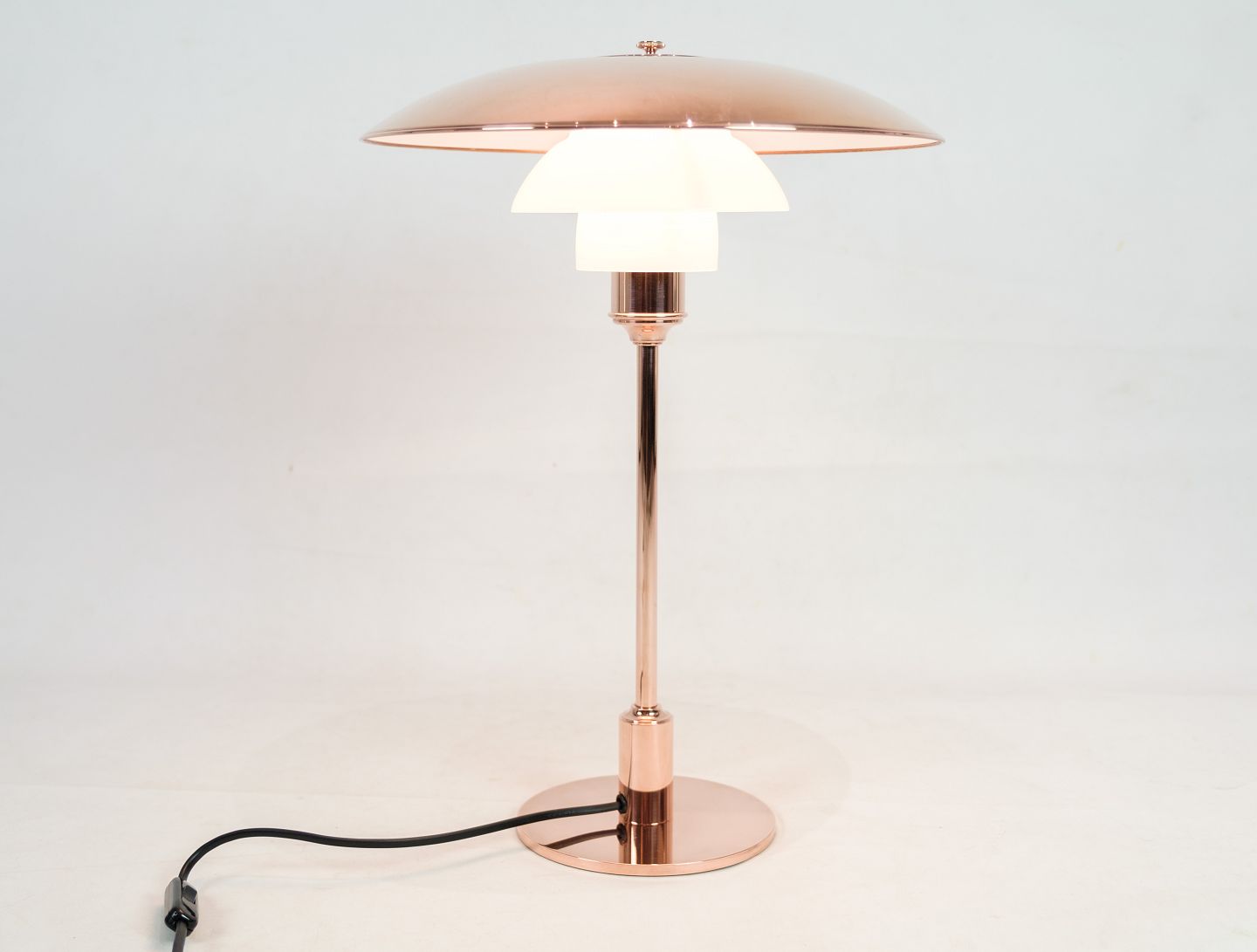 PH Table lamp, model PH3½-2½, limited edition, designed by Poul Henningsen and manufactured by Louis Poulsen. The lamp is made of copper with an upper shade in copper and two lower shades in white opal glass. An upper screen in white opal glass is also included. It was sold for a limited period in 2015. The lamp was originally only produced for 2 years in the period 1927-1929, then taken out of production, probably due to stability problems with the lamp head. Poul Henningsen put the finishing touches on the table lamp in February 1927.