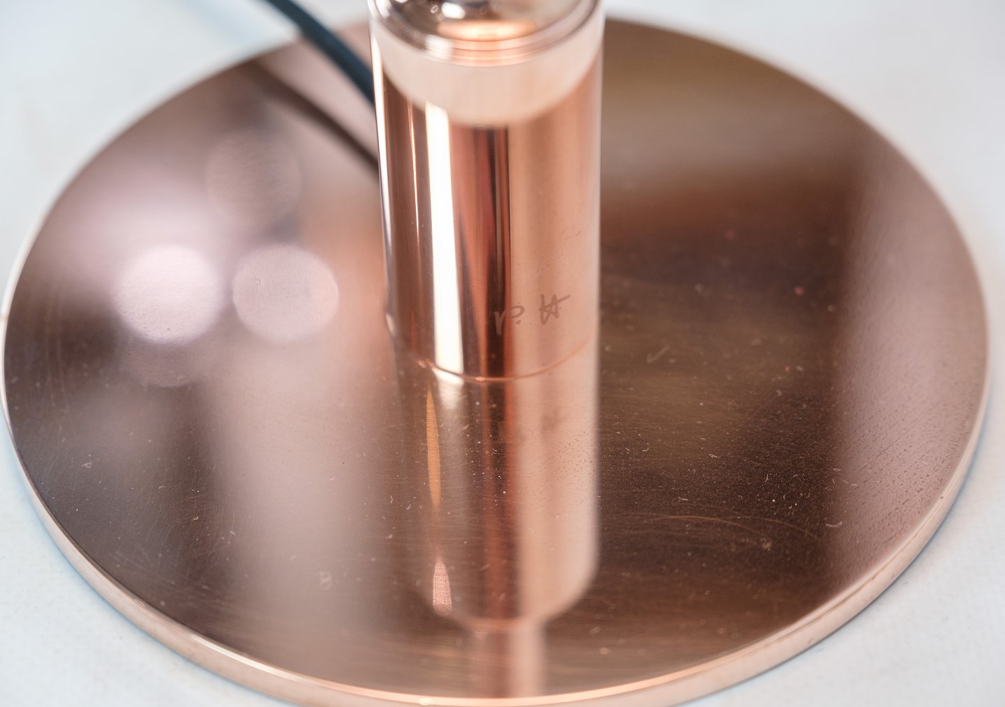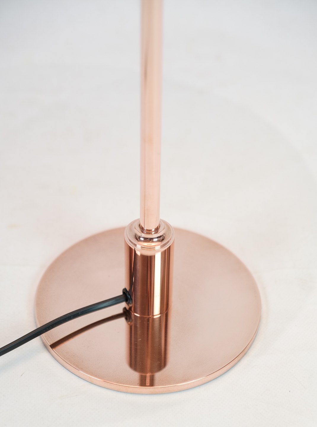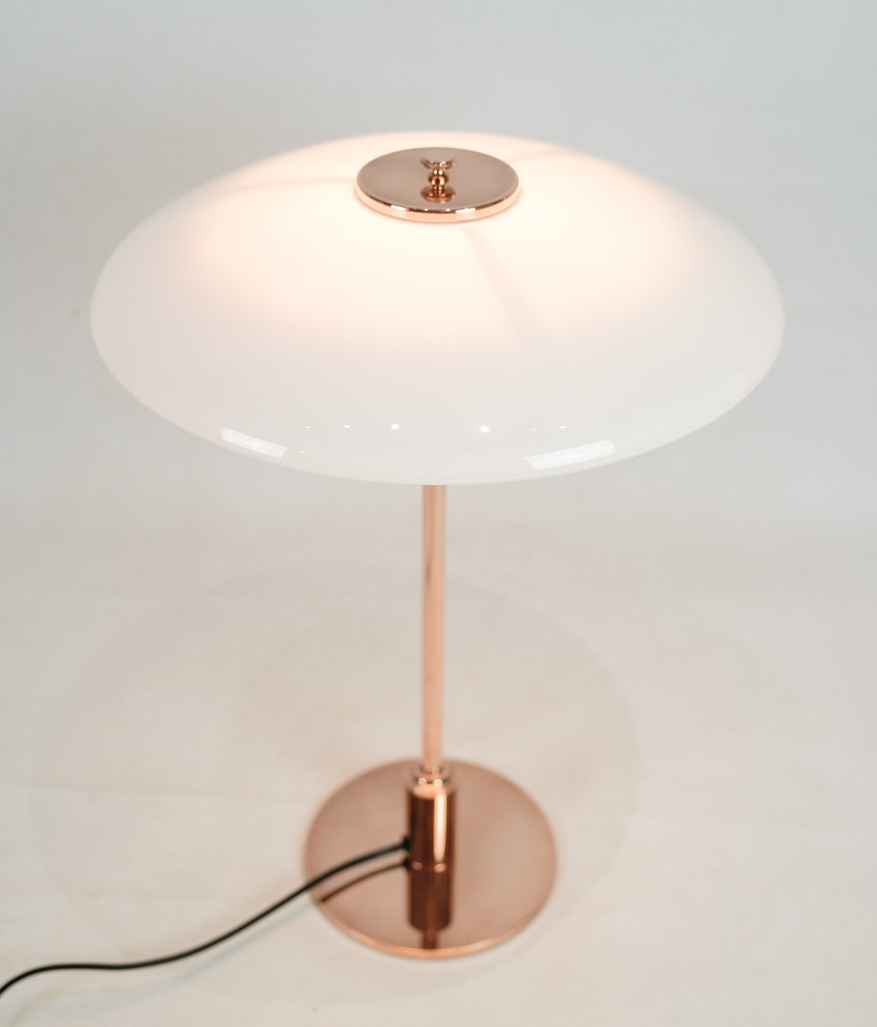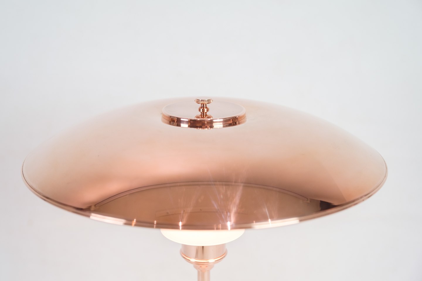 PH Table lamp, model PH3½-2½, limited edition, designed by Poul Henningsen and manufactured by Louis Poulsen. The lamp is made of copper with an upper shade in copper and two lower shades in white opal glass. An upper screen in white opal glass is also included. It was sold for a limited period in 2015. The lamp was originally only produced for 2 years in the period 1927-1929, then taken out of production, probably due to stability problems with the lamp head. Poul Henningsen put the finishing touches on the table lamp in February 1927.