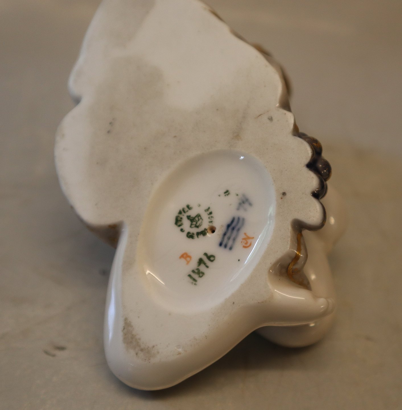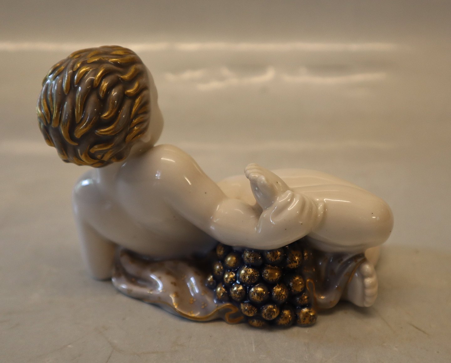 1876 Kgl. Liggende dreng - kerub - Putti med klæde 9.5 x 12 cm med forgyldt hår og druer Michael Pedersen fra Royal Copenhagen I hel og fin stand