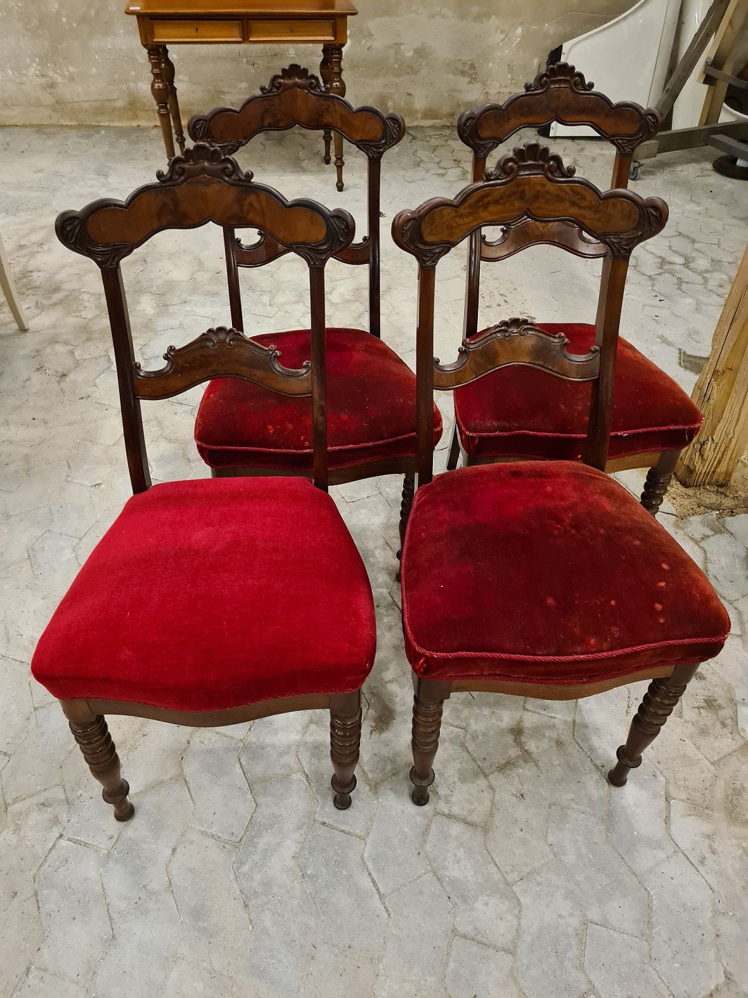 4 Salonstole i mahogni, med rødesædder. Stolene fremstår med pletter på sæderne og løse i ryggen.