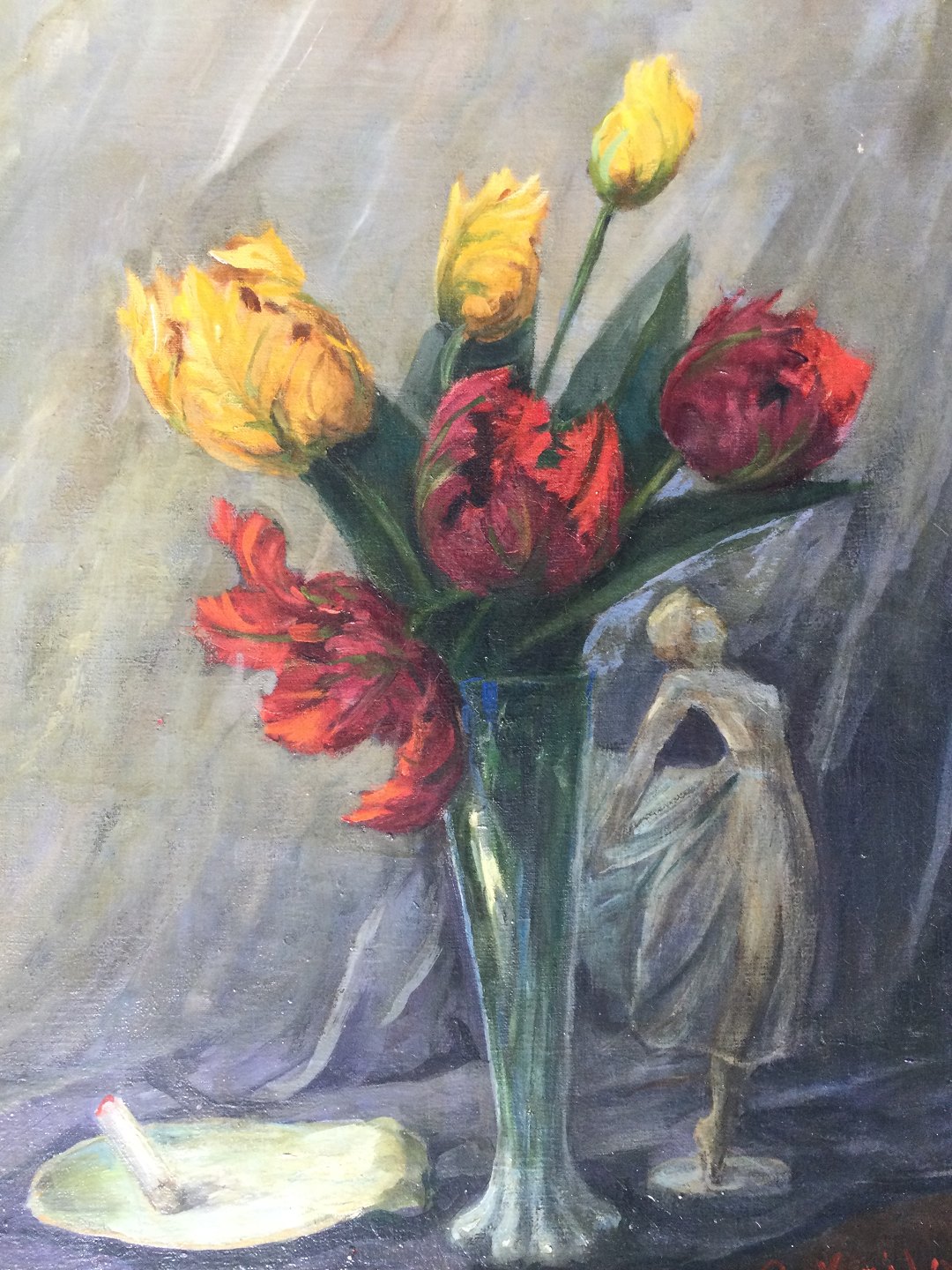 Opstilling med vase med papegøjetulipaner, Statuette og askebæger 1965.