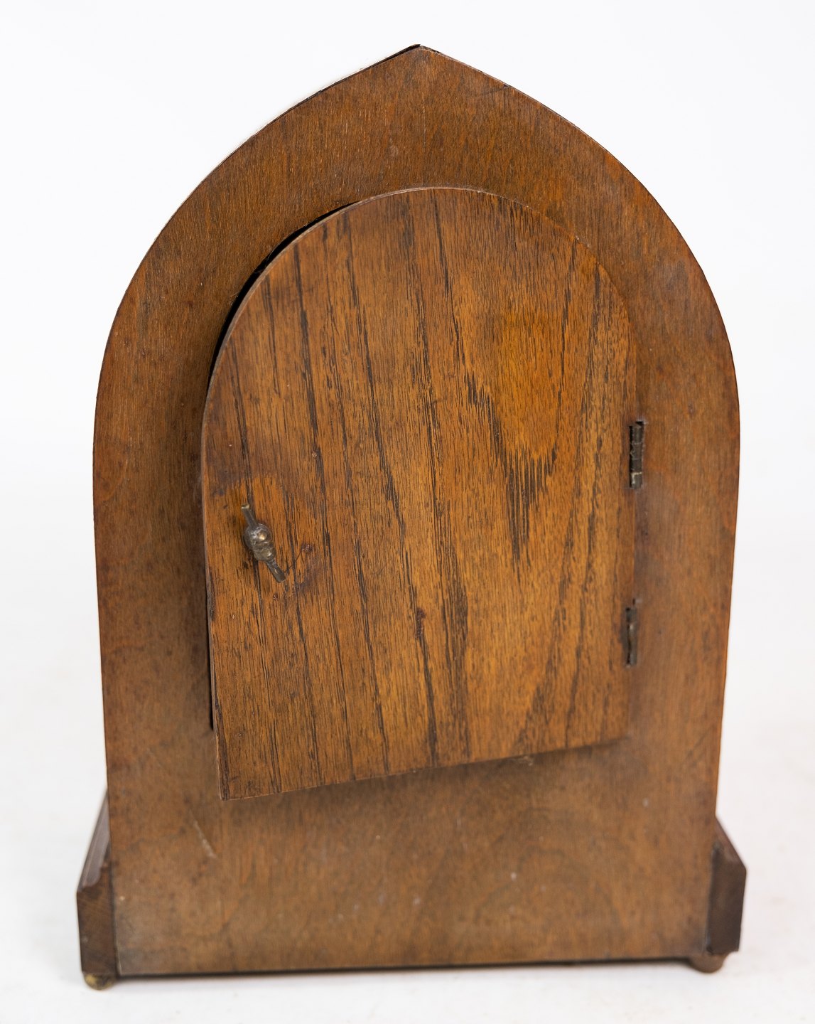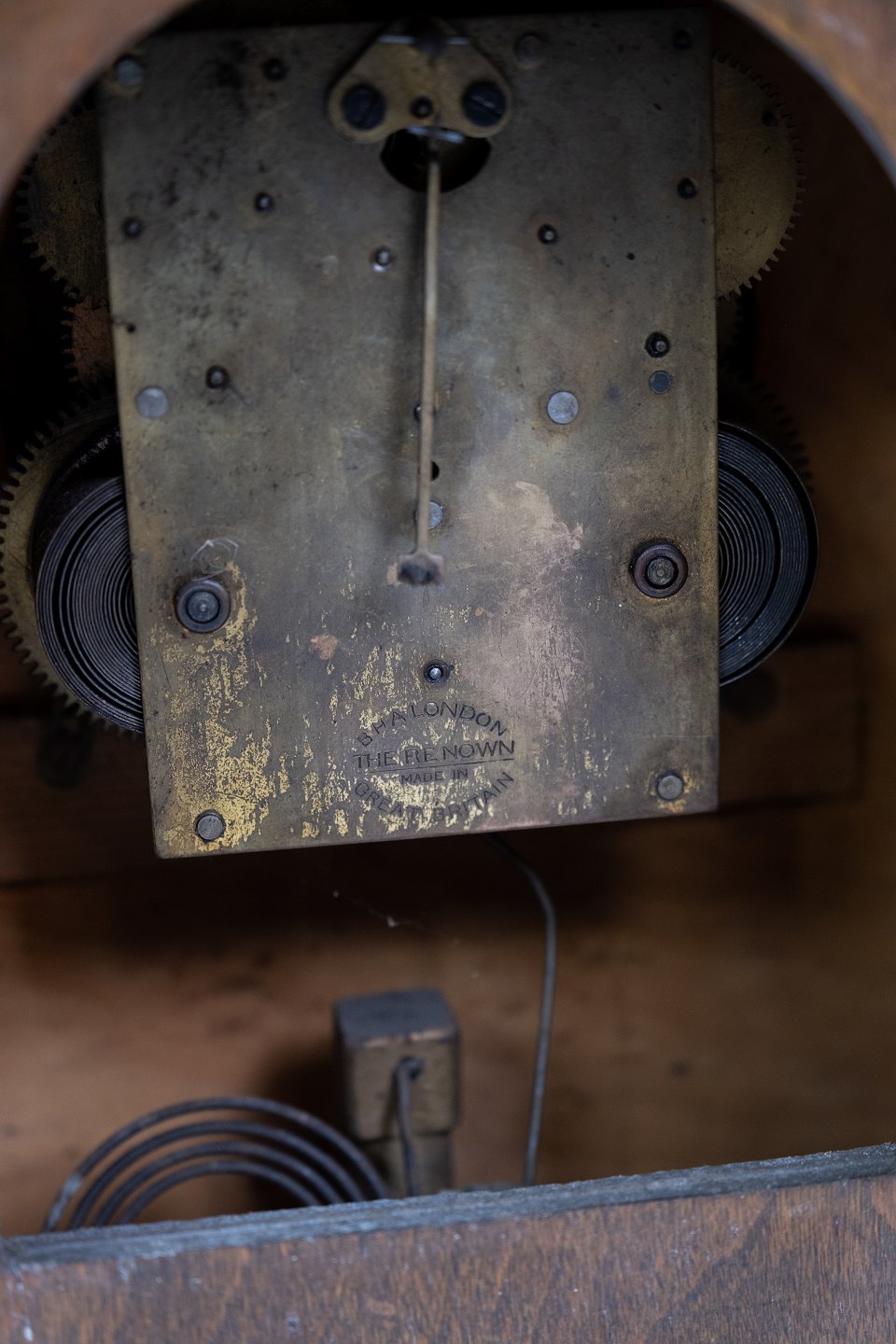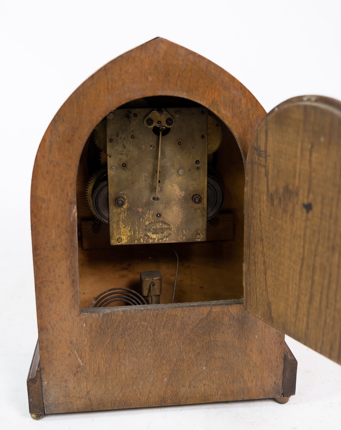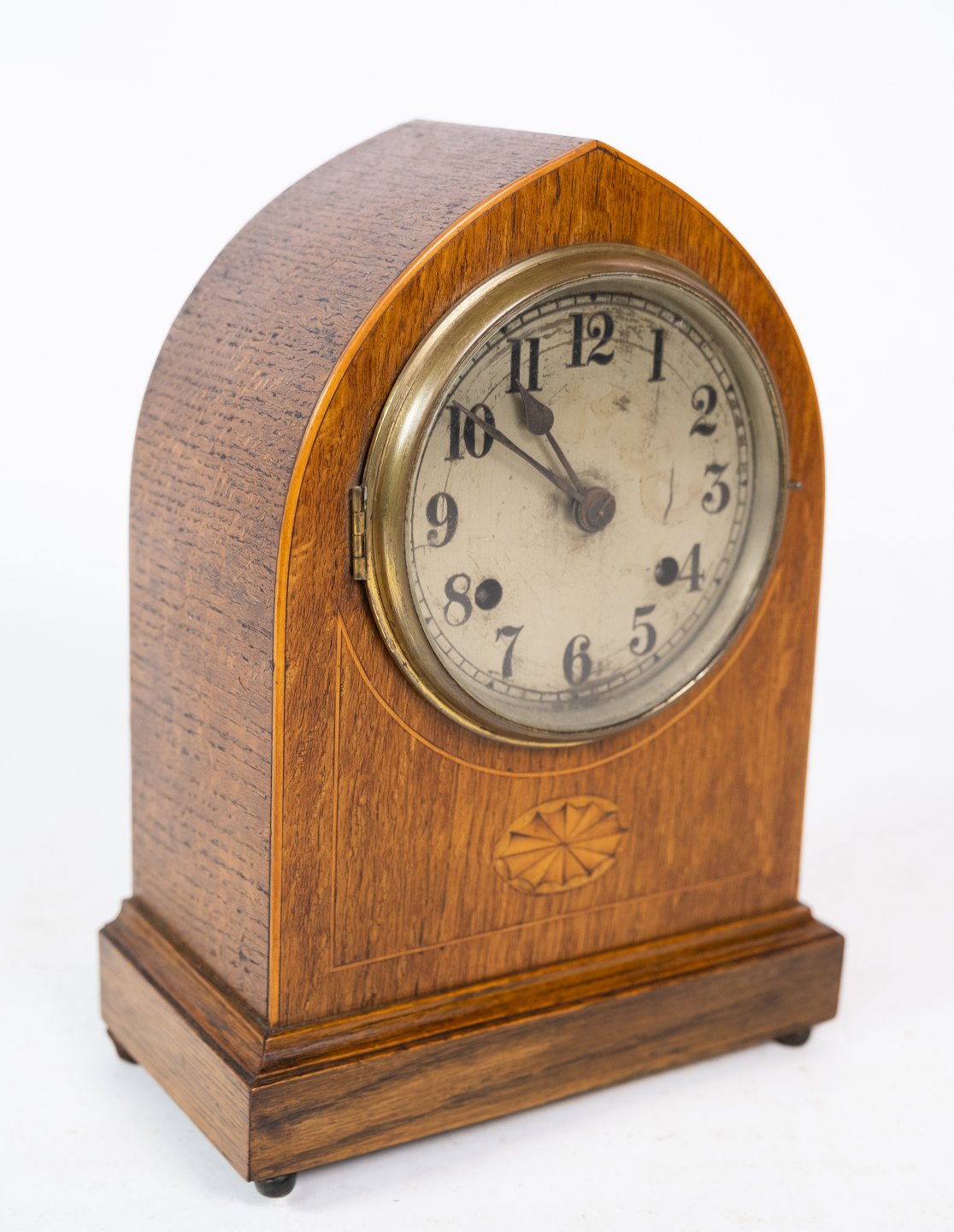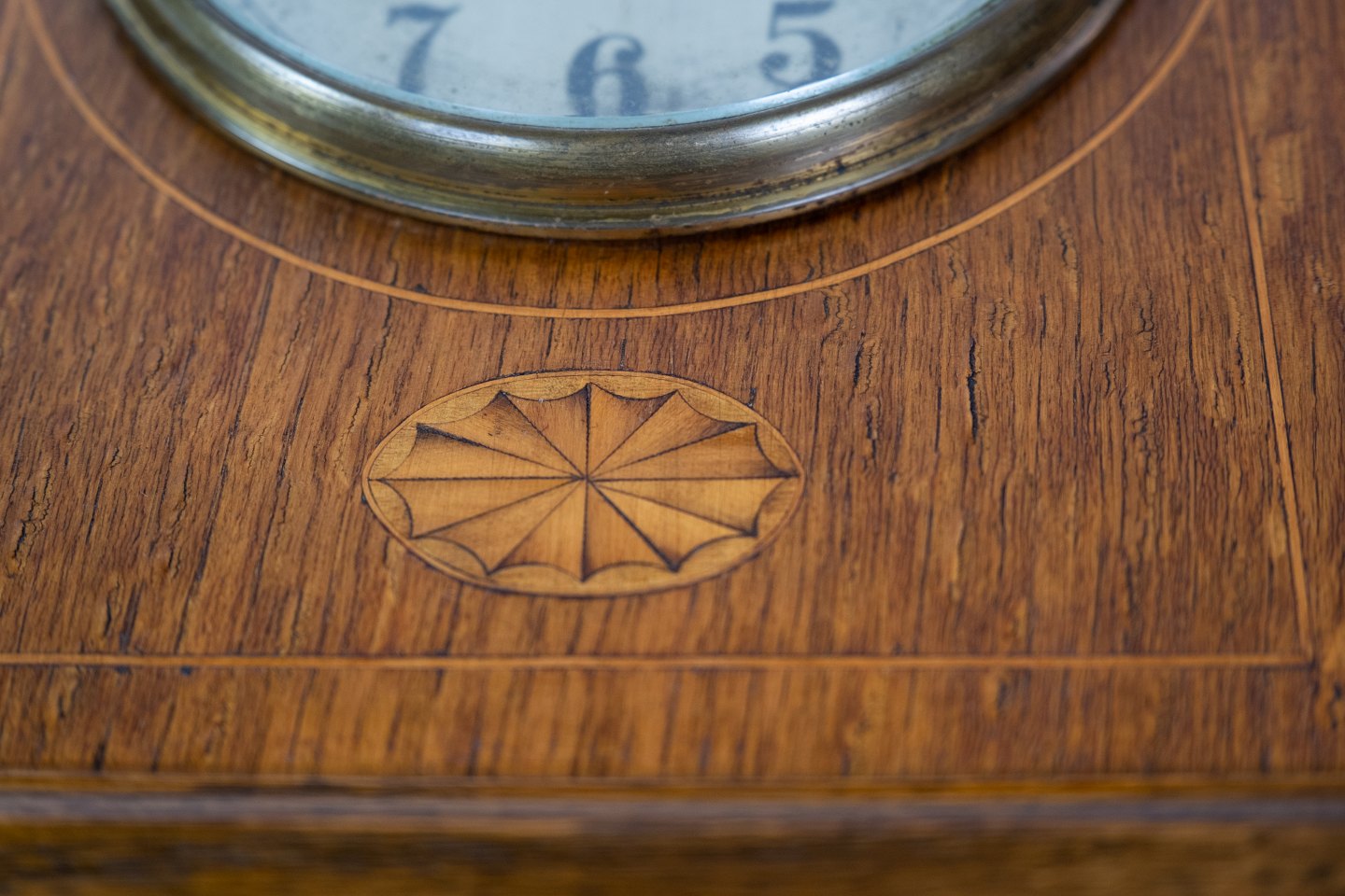 Antique carmine clock in light mahogany with intarsia from around the 1920s.