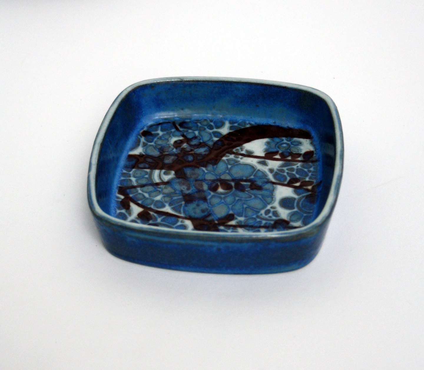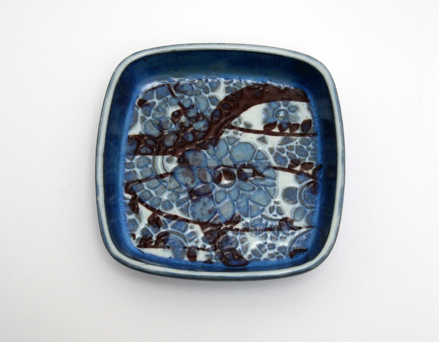Royal Copenhagen, Baca Kunstfajance, Blåt fad/skål. Designet af Jonna Gerber. Nr. 780-2882. 11 x 11 cm. Højde ca. 2,5 cm. Arkivfoto. Denne er III. sortering (medarbejdersortering). Pris: 175 kr. stk. Lager: 1