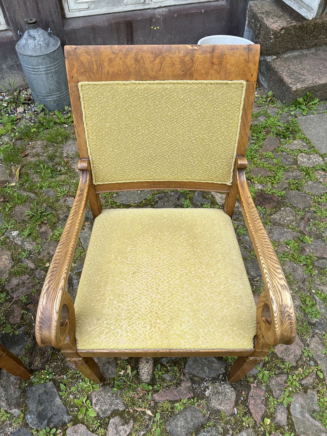 Udført i egetræ med rygstykke i fineret rodtræ. Betrukket med grønt stof.