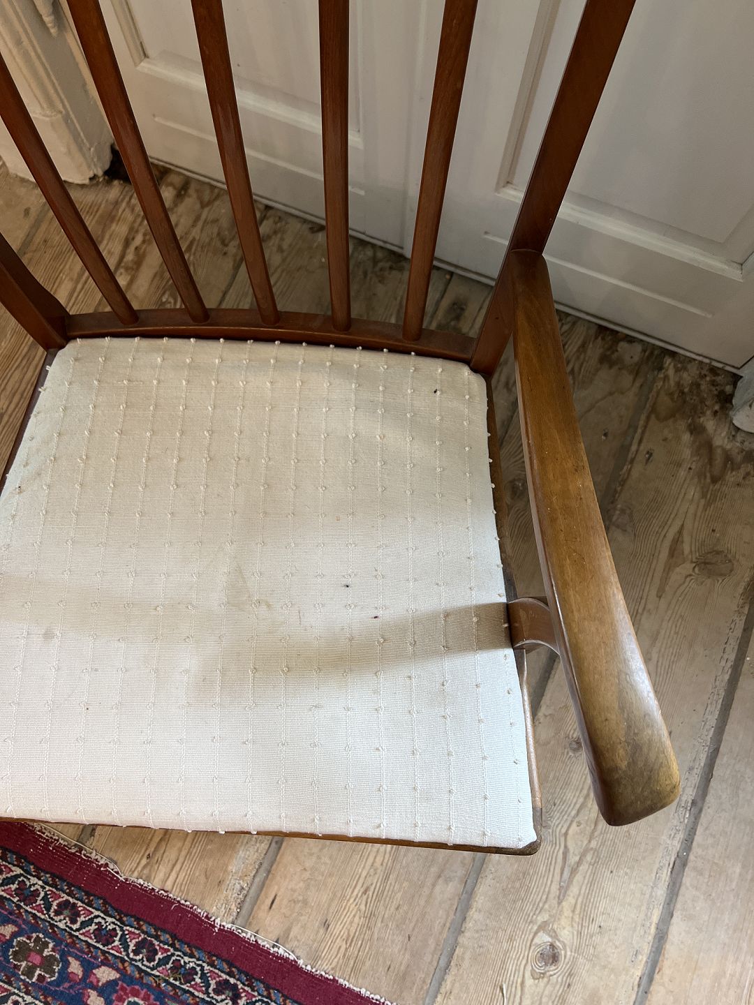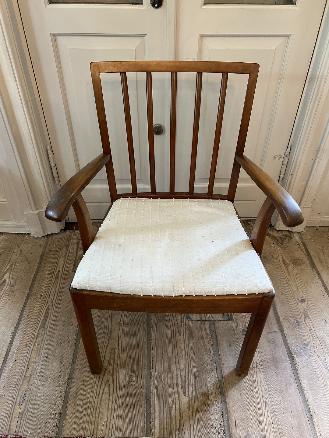 Dansk snedker armstol i bejdset bøgetræ sæde betrukket med hvidt stof. Udført ca. 1930'erne. Brugt stand fremstår med ridser og mæker, samt betræk med pletter.