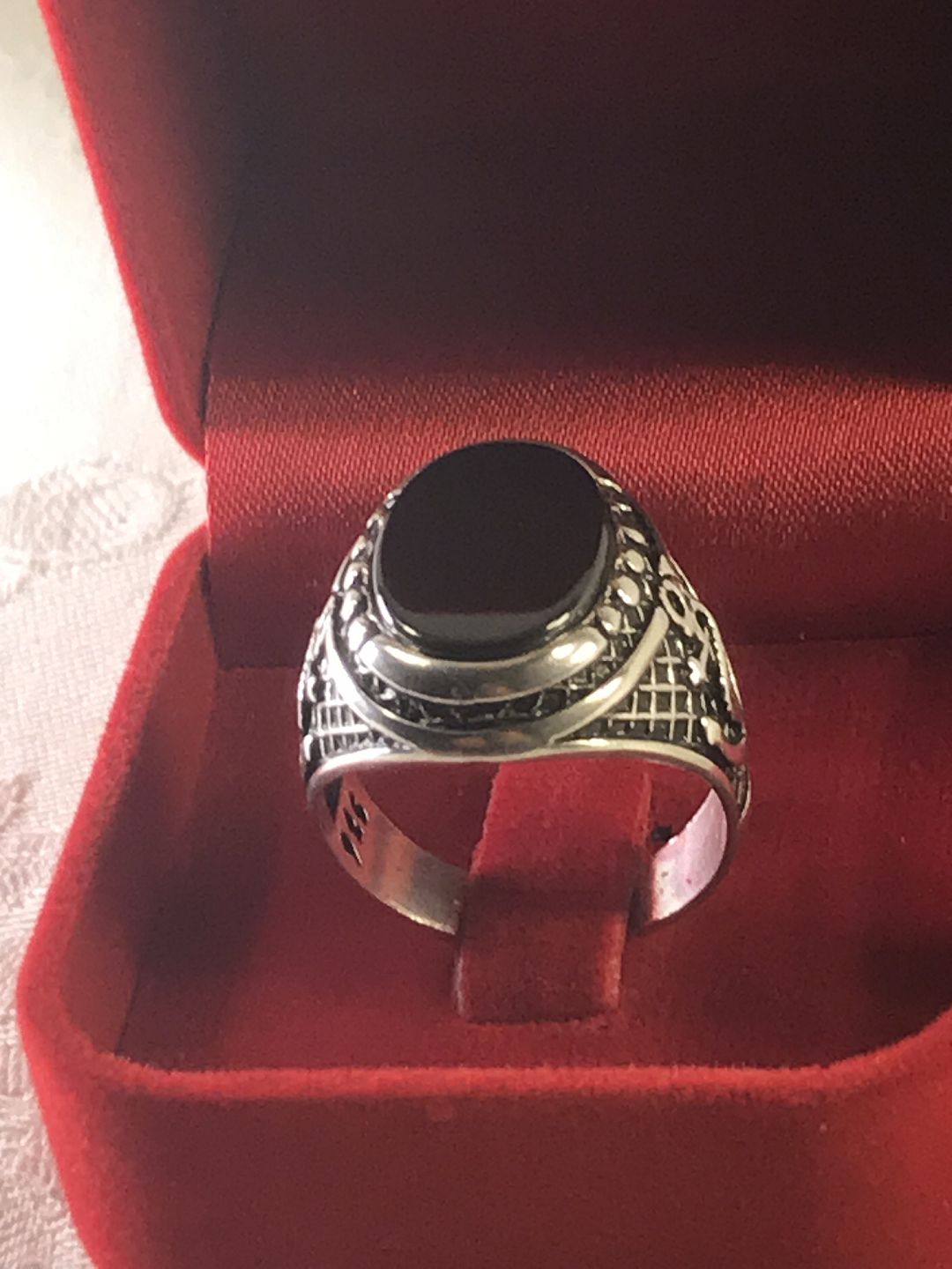 En sølv herre ringe i 925 s med agat oval sort sten .
