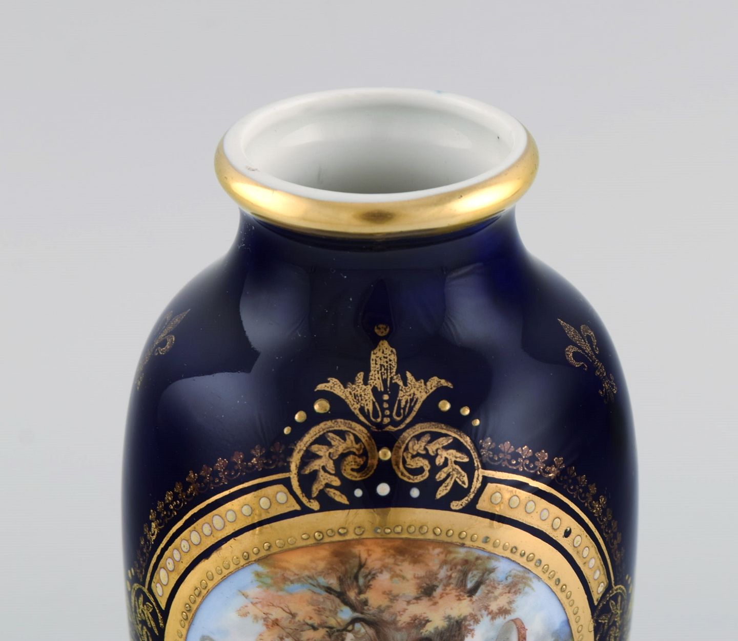 Antique Wien vase in hand-painted porcelain. Classic motifs and gold decoration on a dark blue background. Late 19th century.