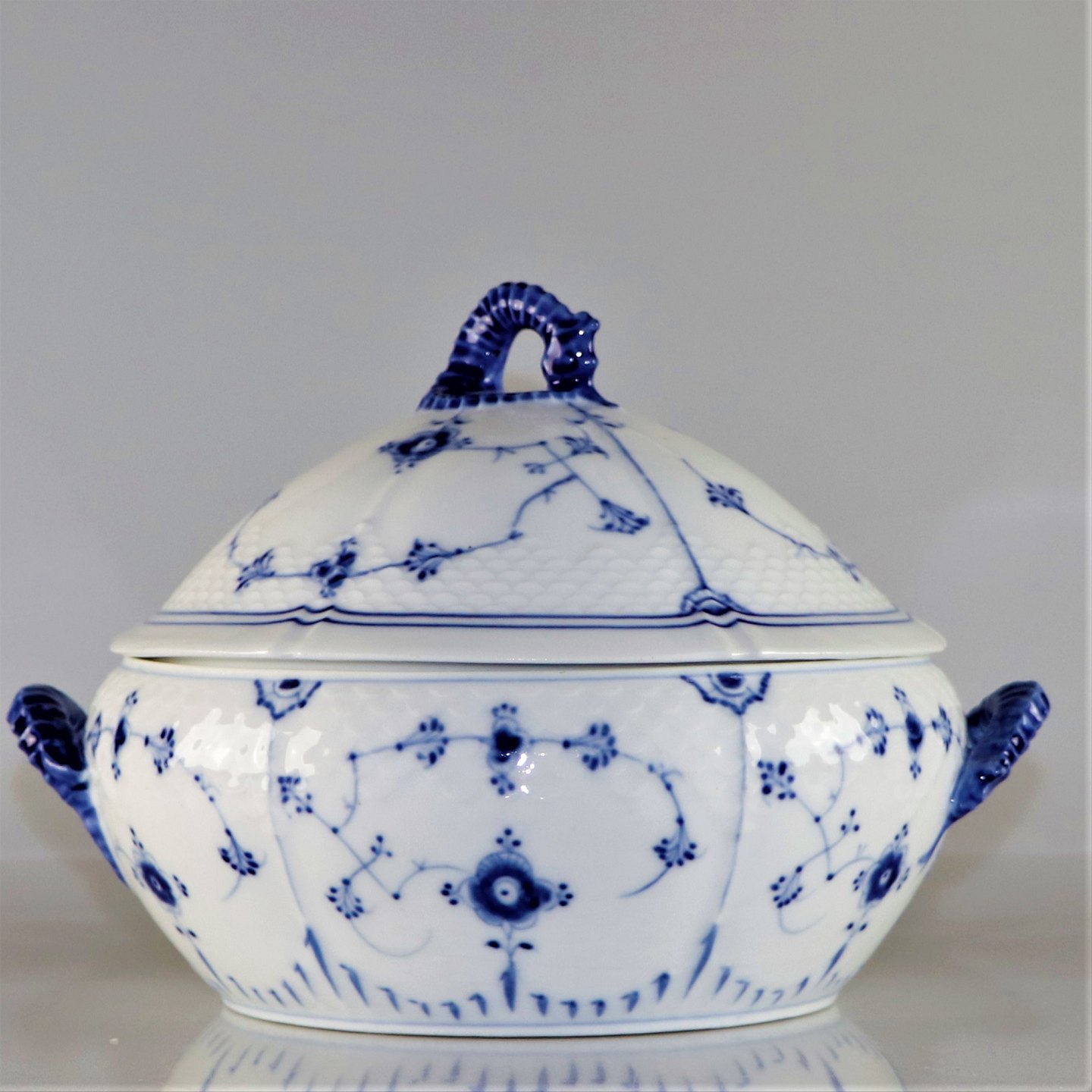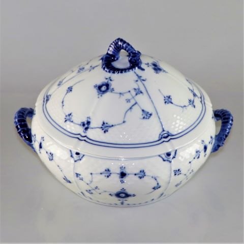 Hvid terrin med blåt mønster, med hanke og låg, blå hanke, små blå blomster, hank på låget B&G, Kartoffelfad