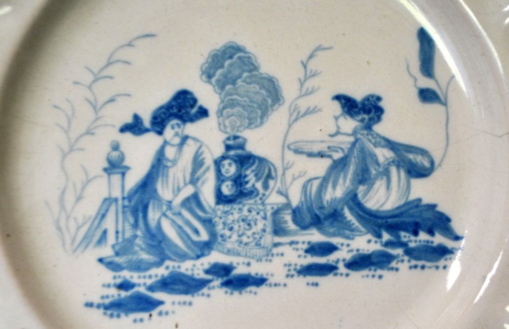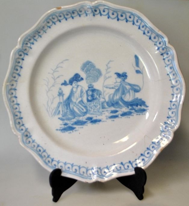 Hollandsk fajance fad, 18./19. årh. Blå/hvid dekoration med to siddende mænd i orientalske dragter. Kantdekoration med mønster. Stemplet. Dia.: 31,5 cm.