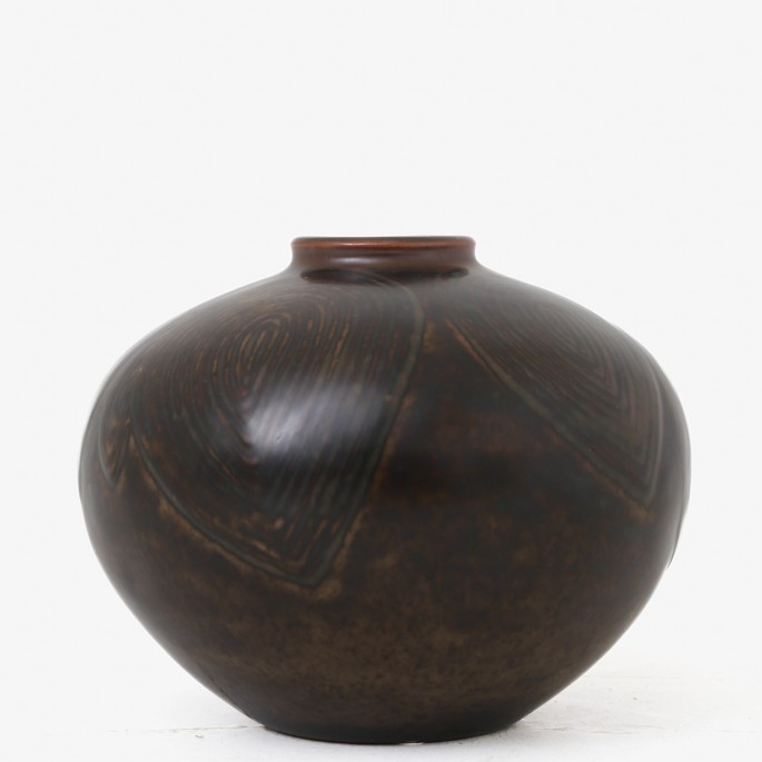 Kuglevase i stentøj med mørk bjørneglasur og bladmotiver. Model 20738. Signeret.