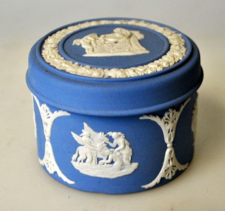 Weedgewood blue jasper bisquit porcelæns låg krukke, 20. årh. England. Dekoreret med klassiske kvinde figurer. Stemplet. H: 5 cm. Dia.: 6,5 cm.