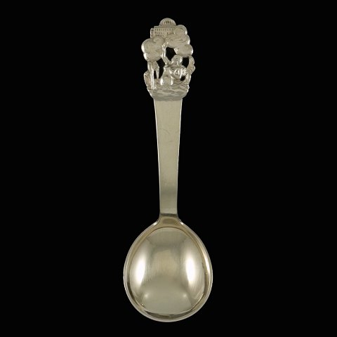 Rund barne/dessert-ske i forgyldt sølv med motiv fra H.C. Andersens eventyr.
