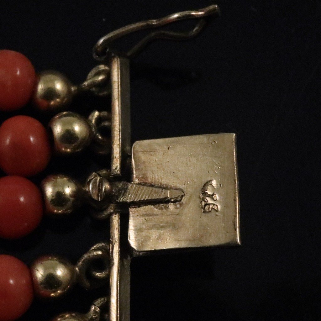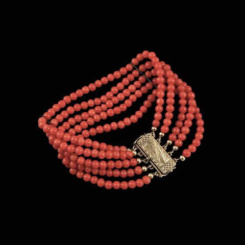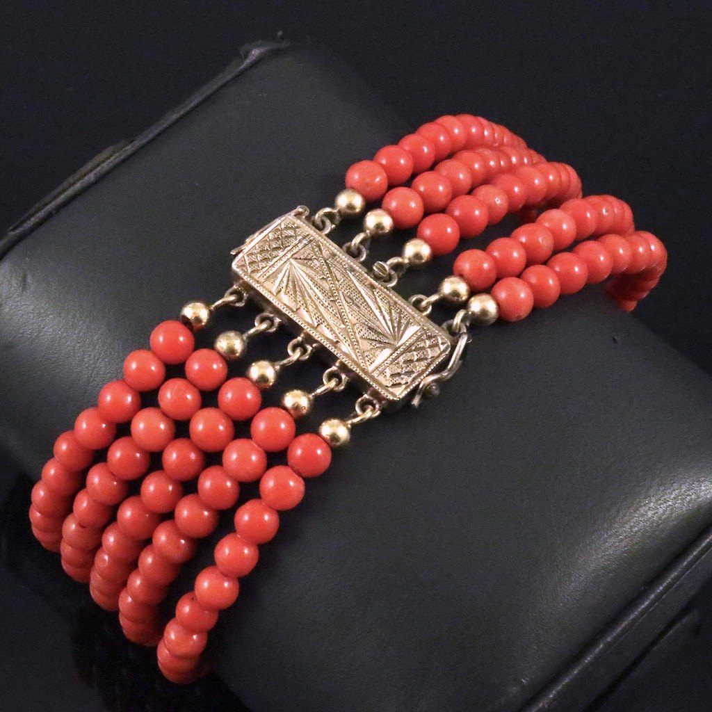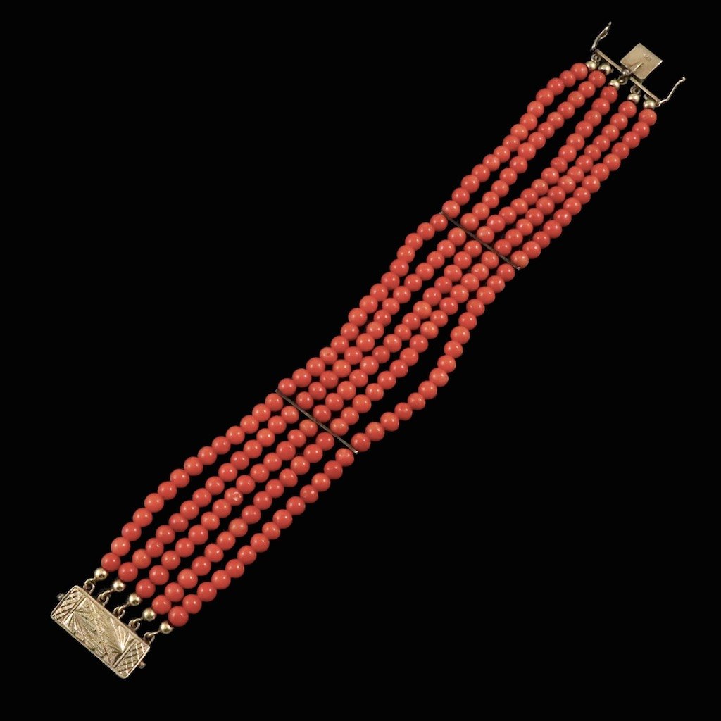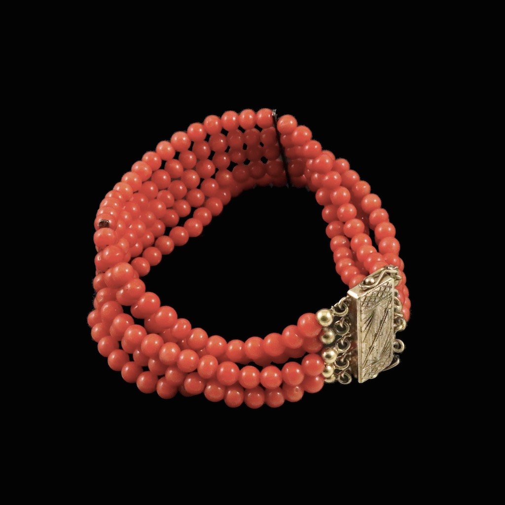 Five-Strand Coral Bead Bracelet with gilded silver lock.