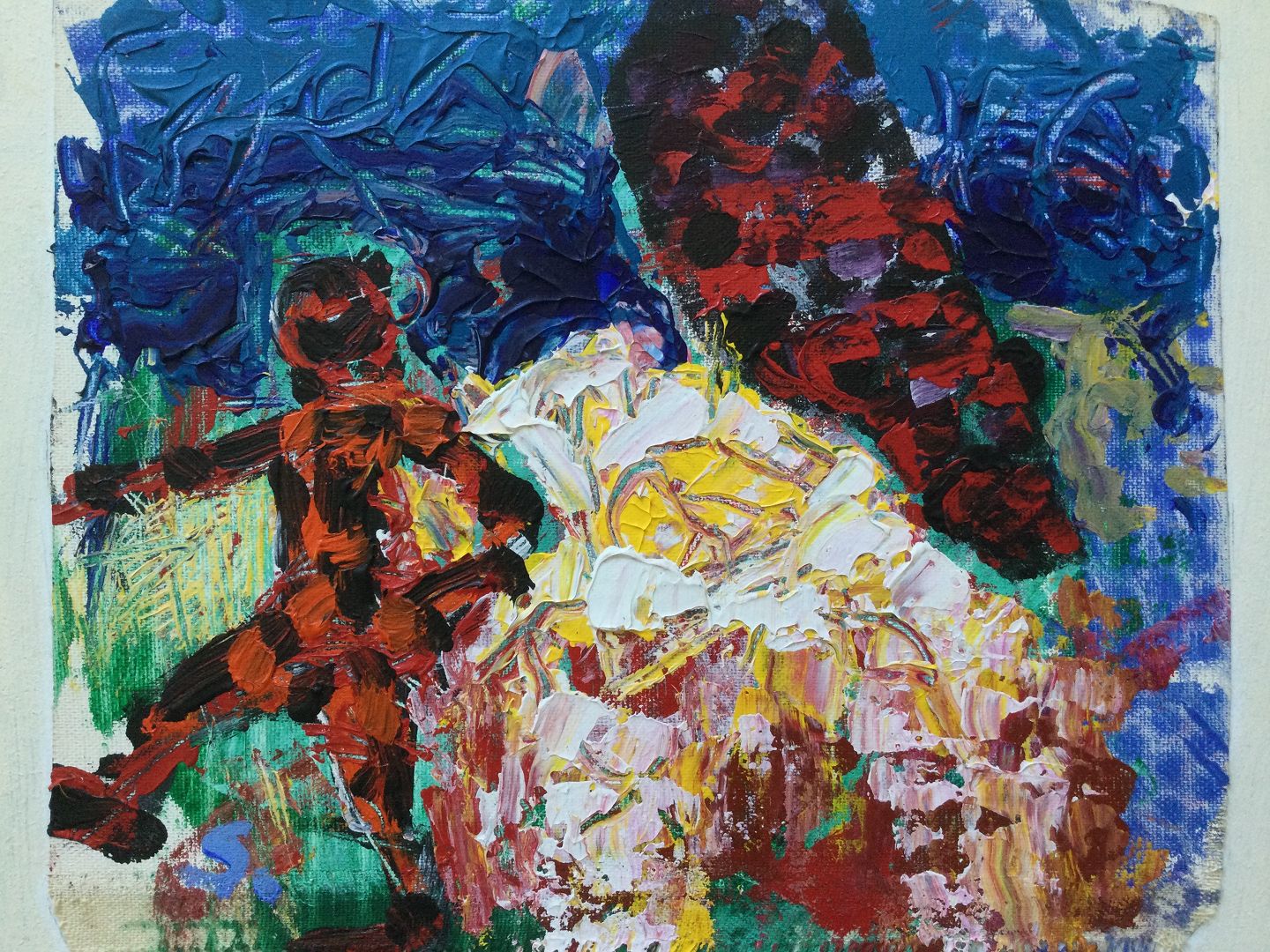 Olie på lærred monteret på hvidmalet plade.