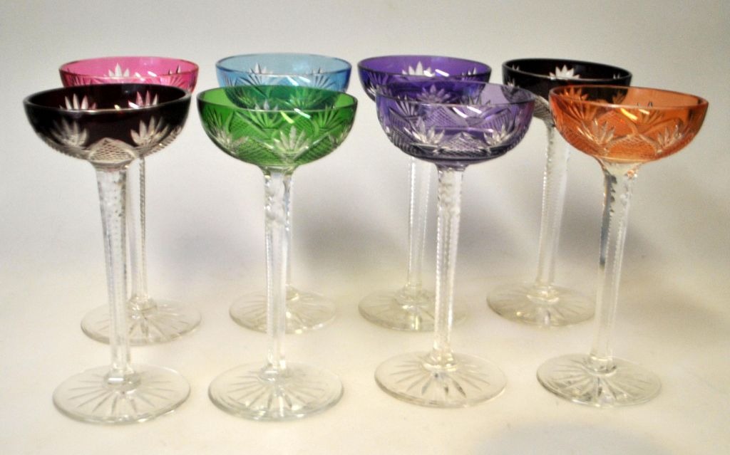Set of 8 Bohemian liqueur crystal glasses with colored basins, 20th century.