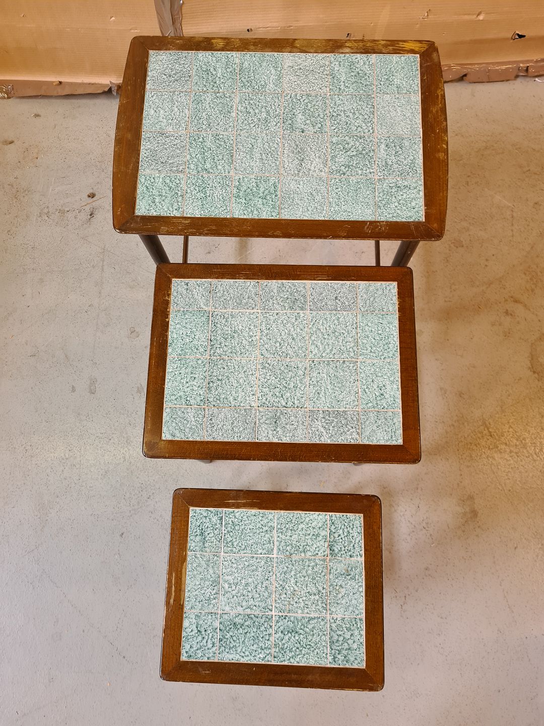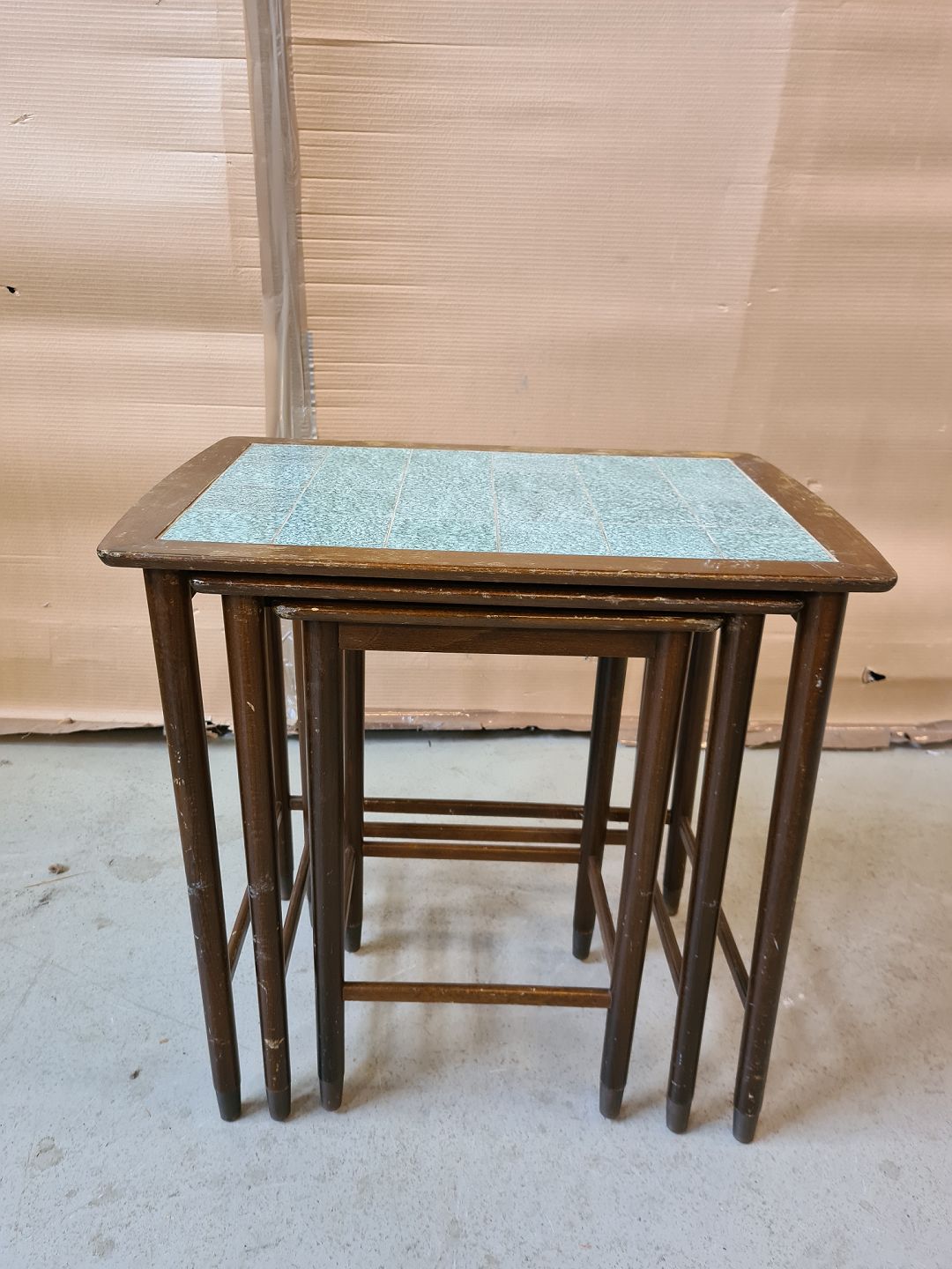 3 Indskudsborde i nødetræ med kakler, fra 1950erne.