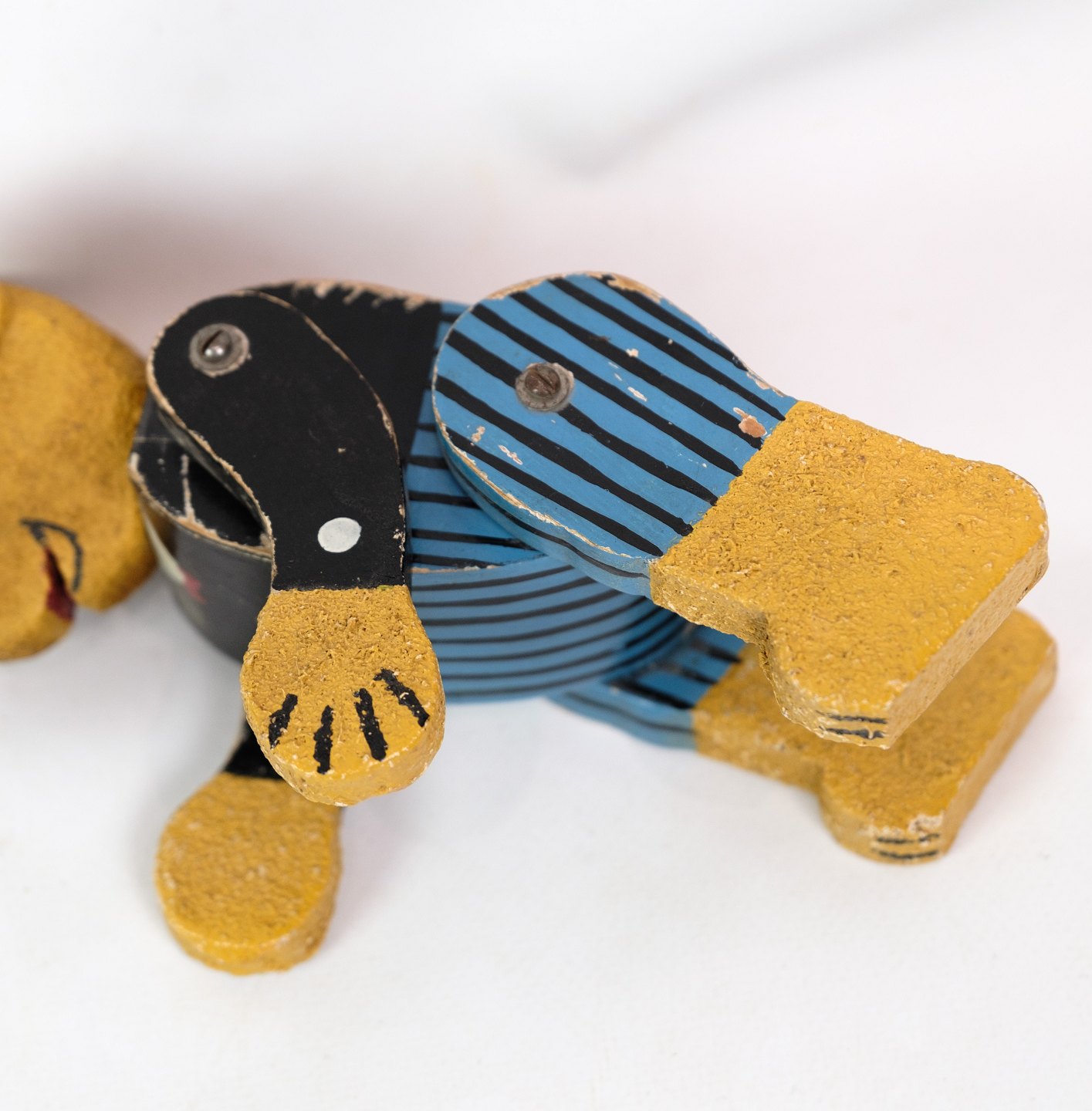En legetøjs bamse lavet af træ som gennem årene har fået patina fremstillet ca. år 1950'erne.