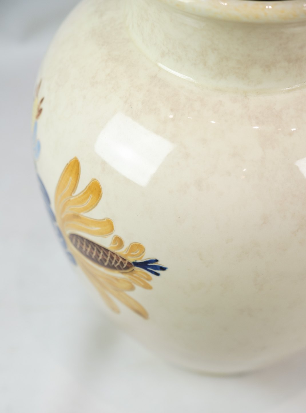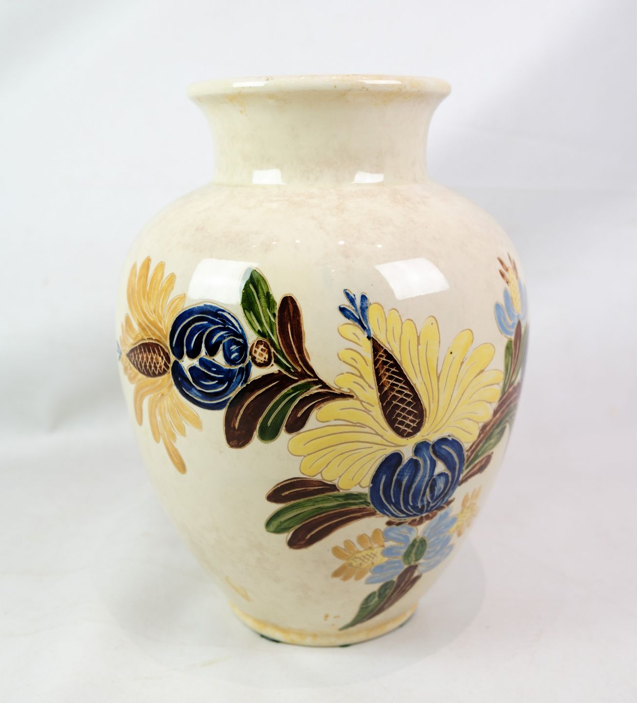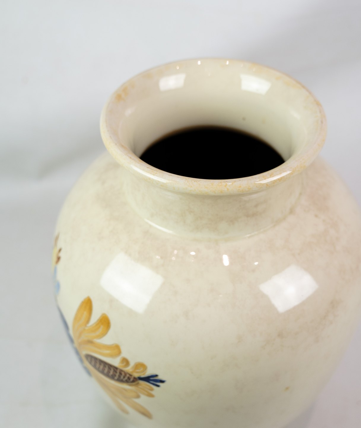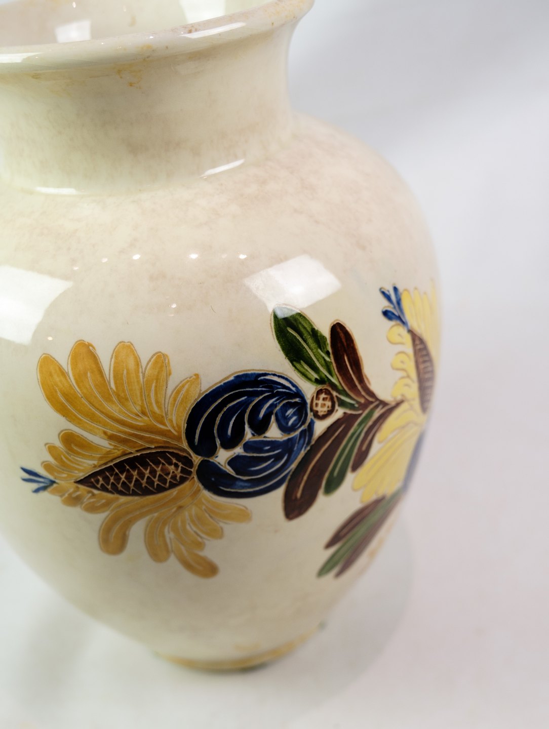 En gulvvase i lyse farver og smukt motiv af Knapstrup keramik.