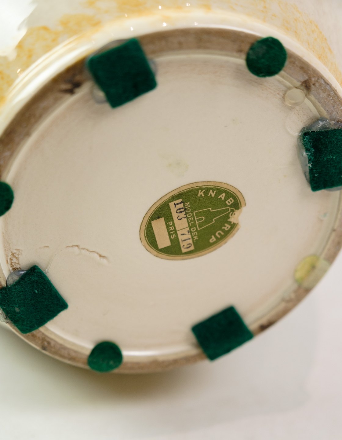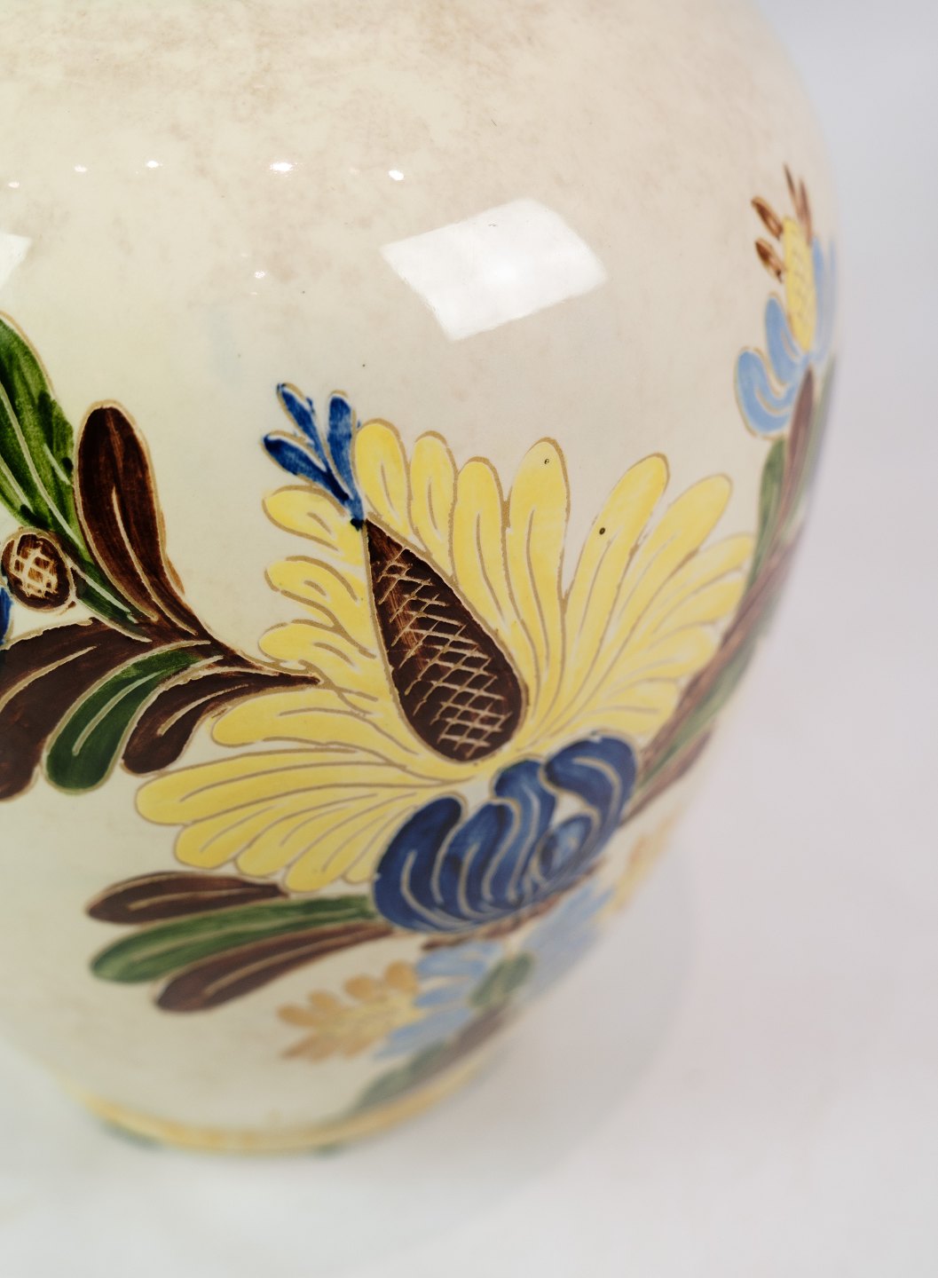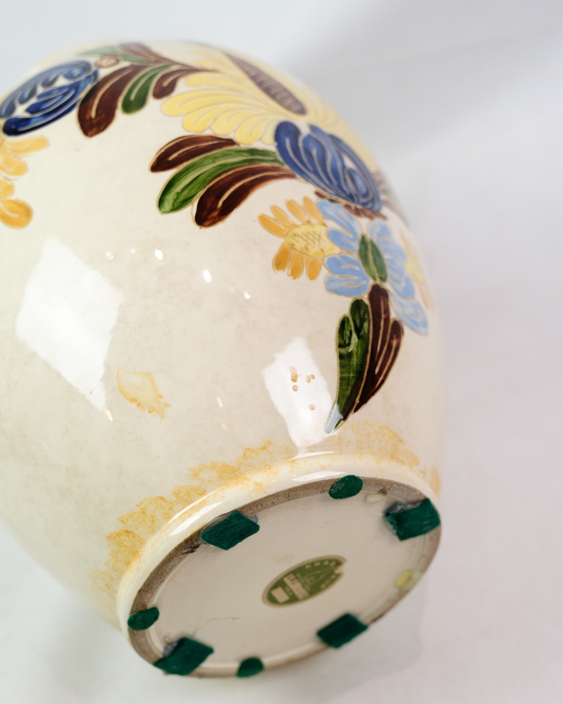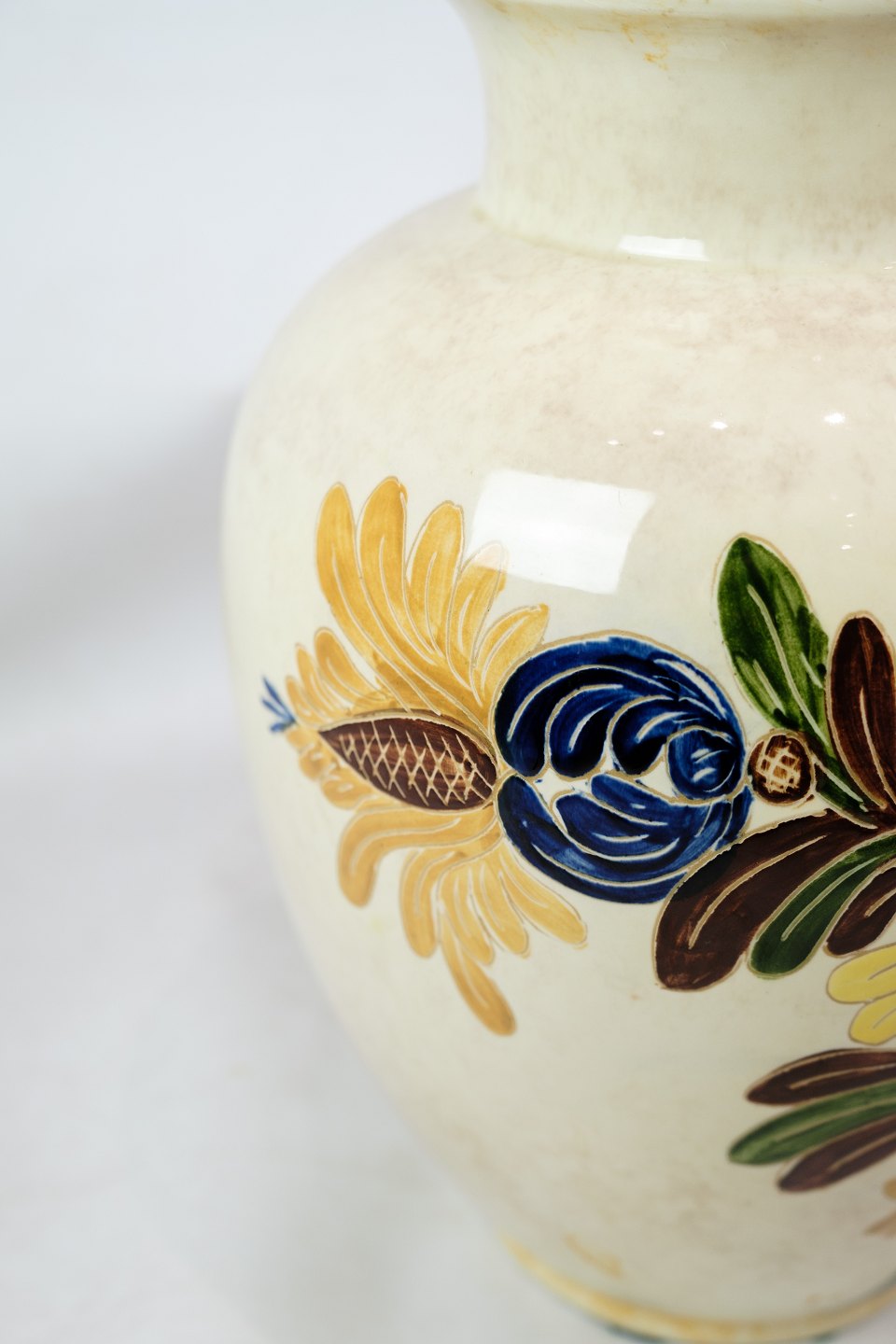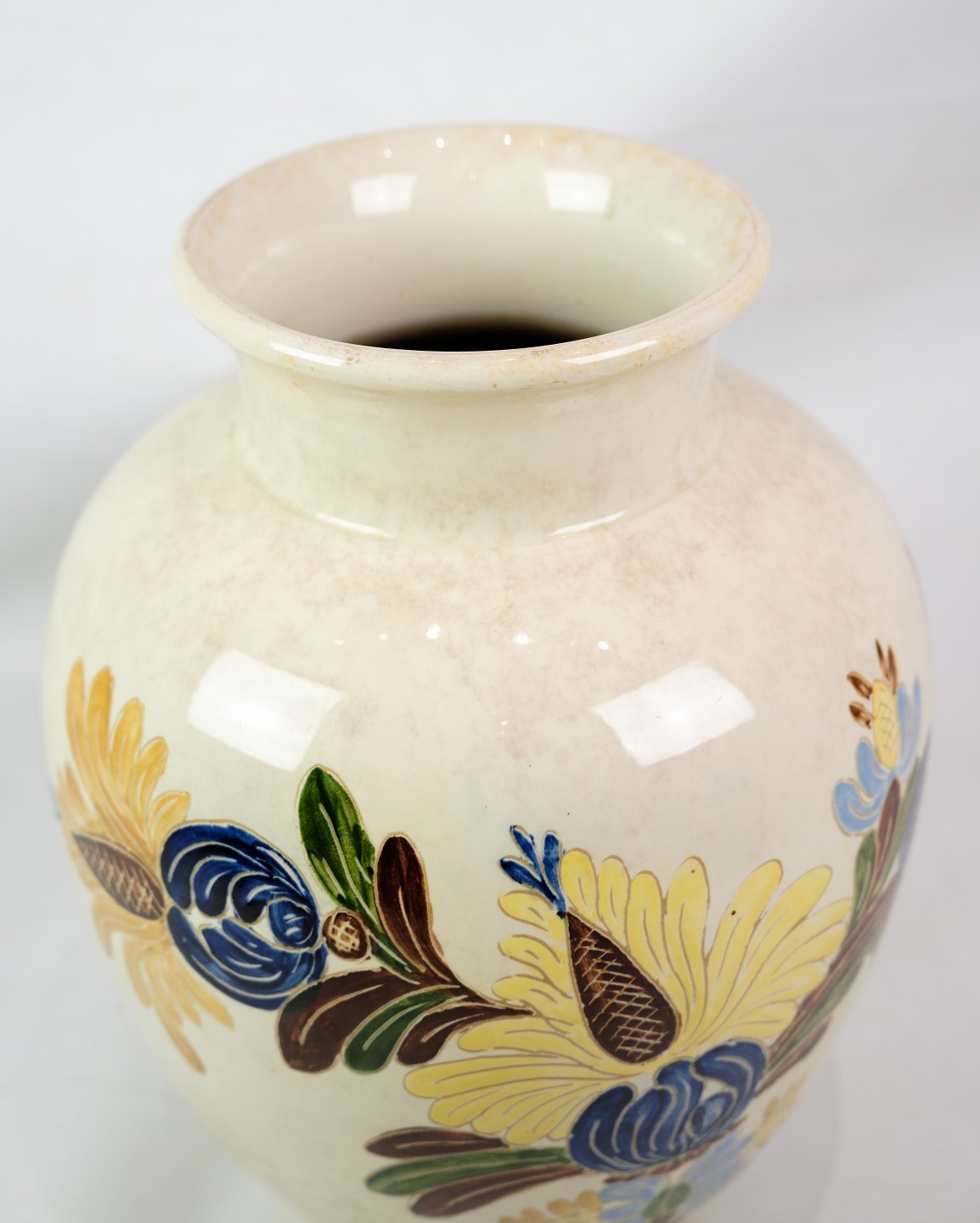 En gulvvase i lyse farver og smukt motiv af Knapstrup keramik.