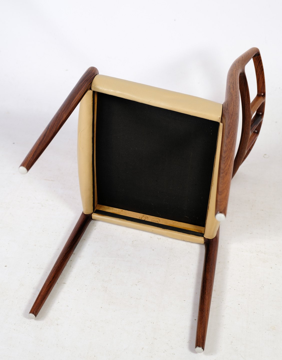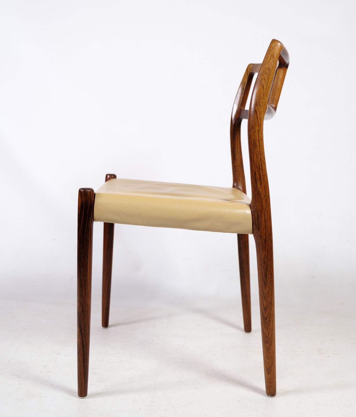 Sæt af seks spisestuestole, Model 79, designet af Niels O. Møller i træsorten palisander fra Danmark 1960'erne. Disse smukt formede stole er fremstillet af J.L. Møller Møbelfabrik. De er lavet af massiv palisander og har et flot design til ryglænet. De står med smukt lyst læder.