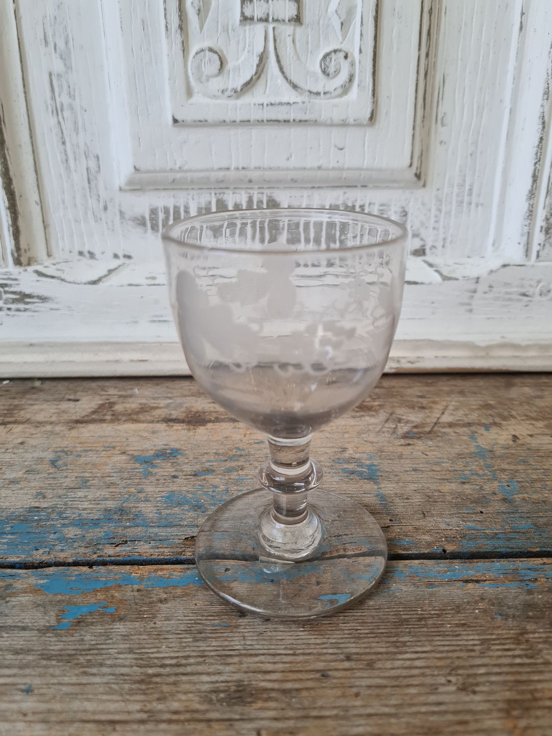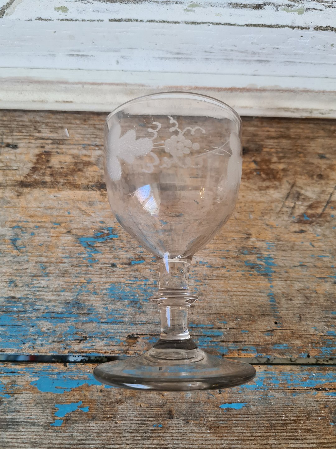 1800tals dansk vinglas på stilk med knap, dekoreret med matslebet vinløvsranke med 3 drueklaser