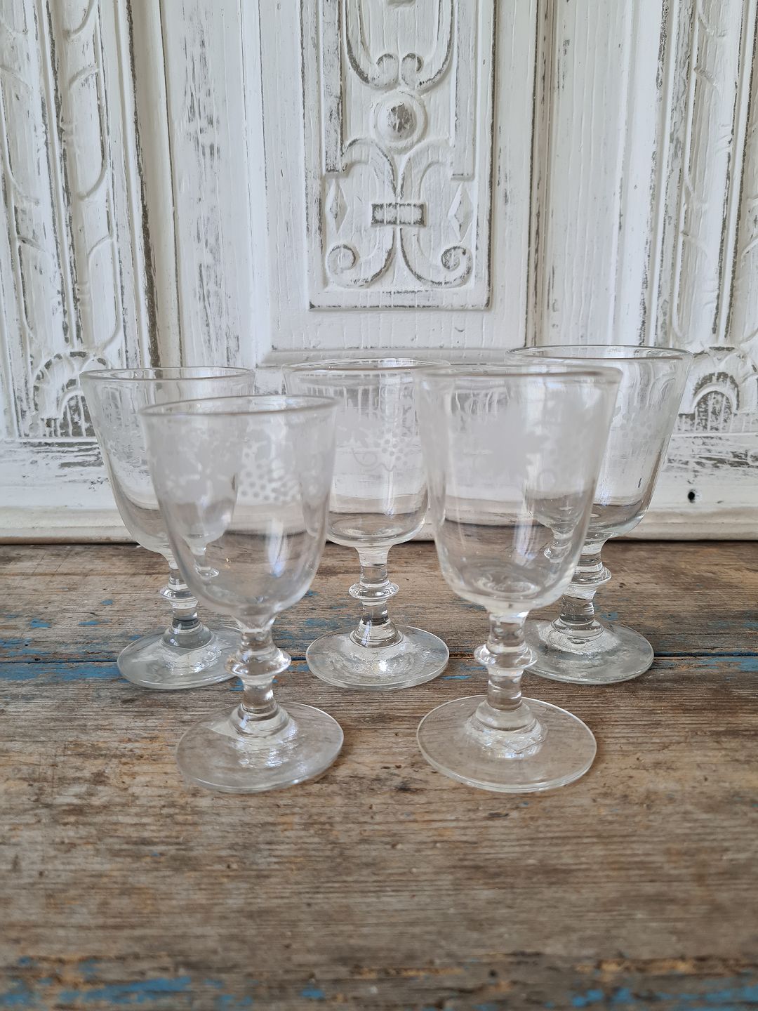 Set of 5 antique wine glasses decorated with bunches of grapes and vine leaves