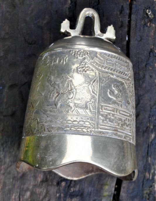 Chinese gong gong, 20th century. Bell in ore. Suspension in black wood with silver inlays. Decorated with dragons. Suspension: 43 x 25 cm. Bell decorated with warriors, fishermen and readers. H.: 18 cm. Dia.: 11.5 cm.