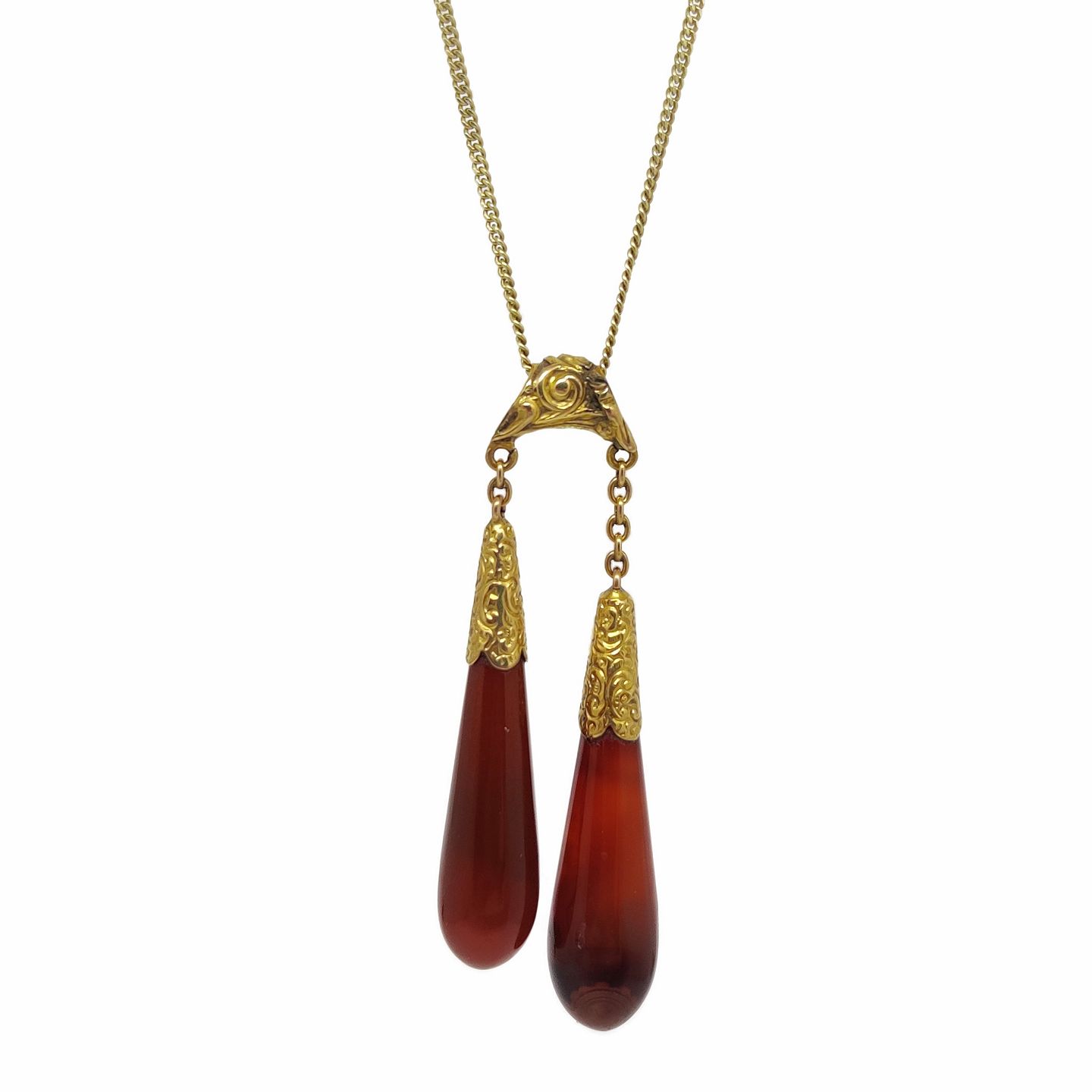 Lang halskæde i 14 kt. guld, prydet med to dråbeformede carneoler.