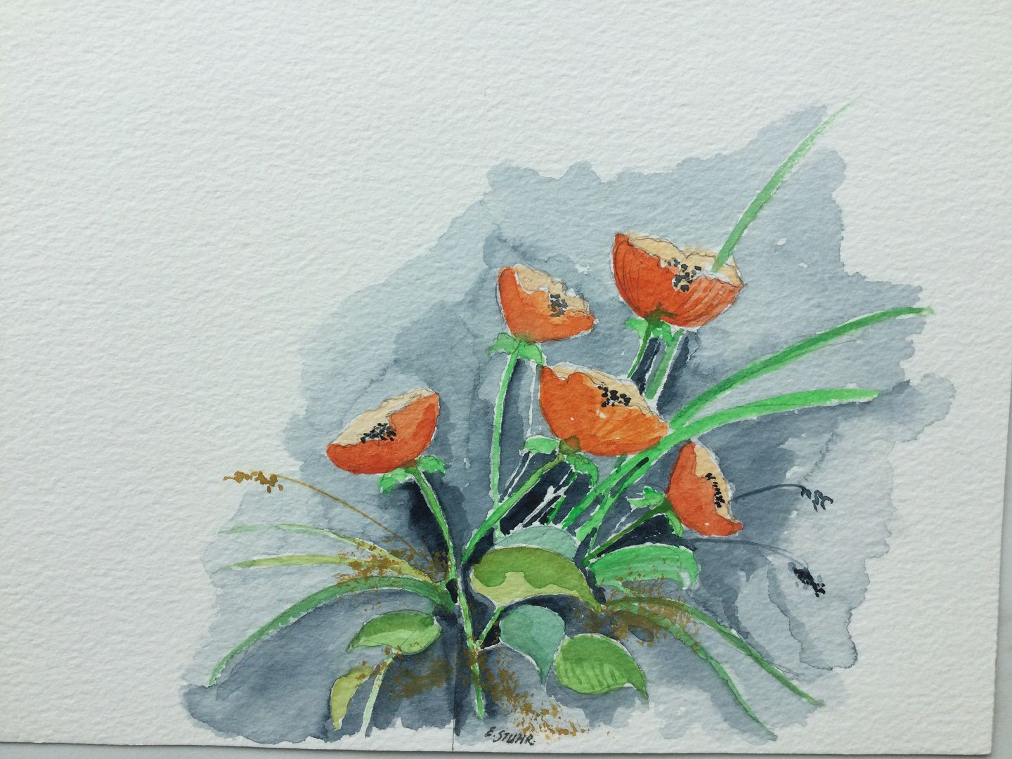Akvarel af Erik Stuhr - Buket valmuer.