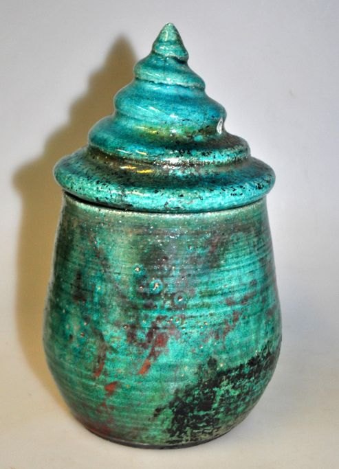 Dansk keramiker (20. årh.) Lågkrukke. Raku. Med turkis/lustra glasur. Låg udformet som et sneglehus. Signeret. H.: 19 cm.