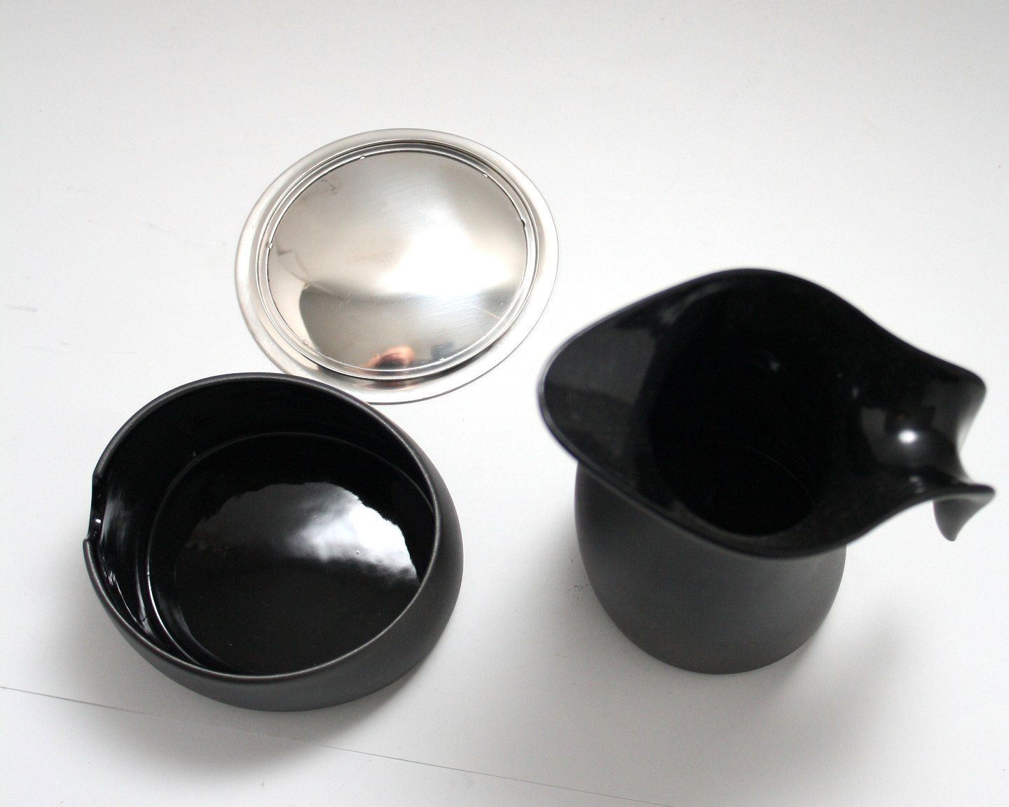 Text available in Danish: Georg Jensen, Sukker og flødesæt. Keramik sortglasseret indvending og ru overflade udvendig.