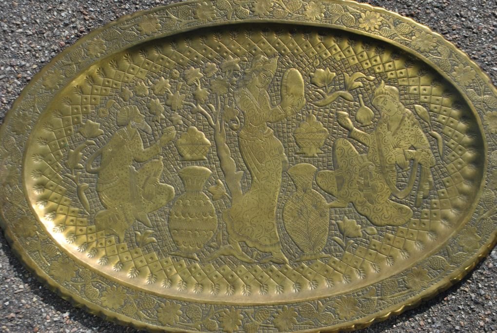 Large oval oriental dish, hammered brass, approx. 1950. Persia