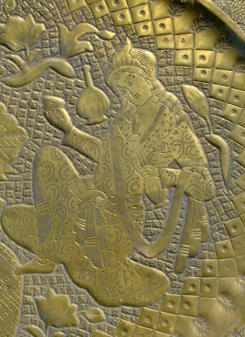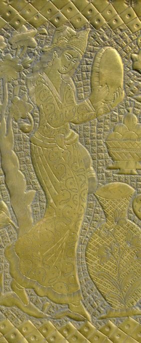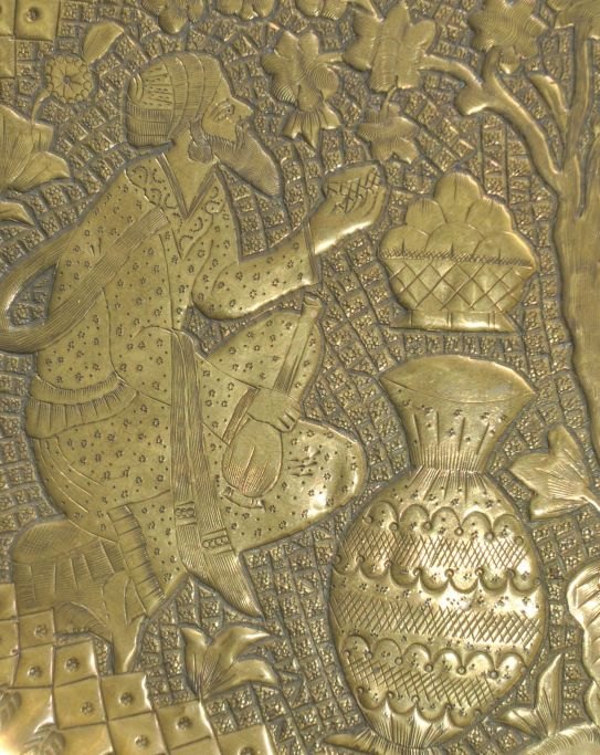 Large oval oriental dish, hammered brass, approx. 1950. Persia. Hammered decorations with dancing and seated listening. Edge decorated with foliage. 47 x 69 cm.